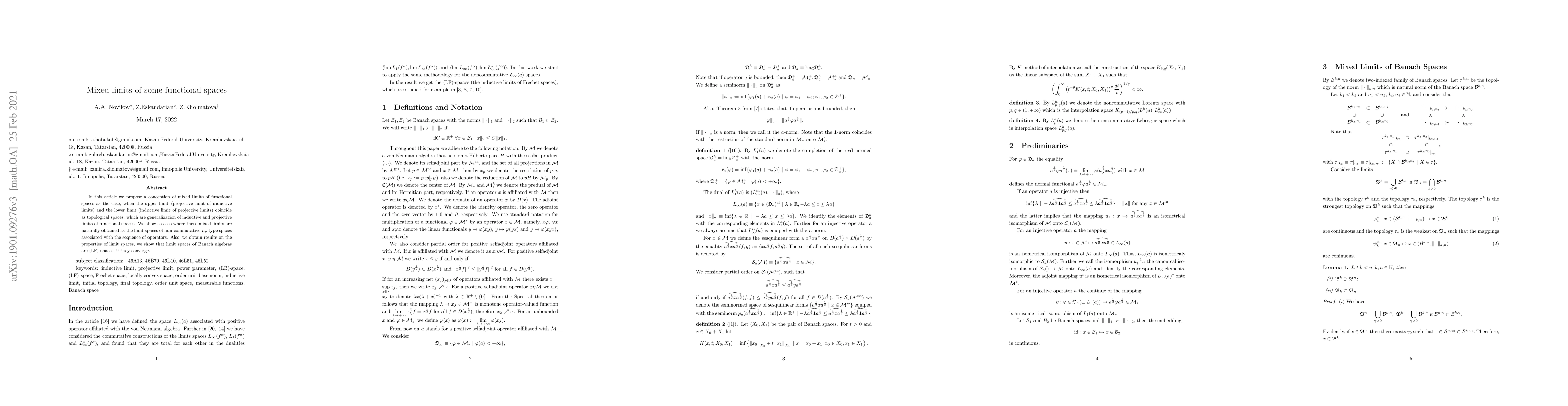 Summary: This paper introduces mixed limits of functional spaces, where upper and lower limits coincide as topological spaces, generalizing inductive and projective limits. It demonstrates instances of these mixed limits in non-commutative $L_p$-type spaces and proves that limit spaces of Banach algebras are (LF)-spaces under convergence.