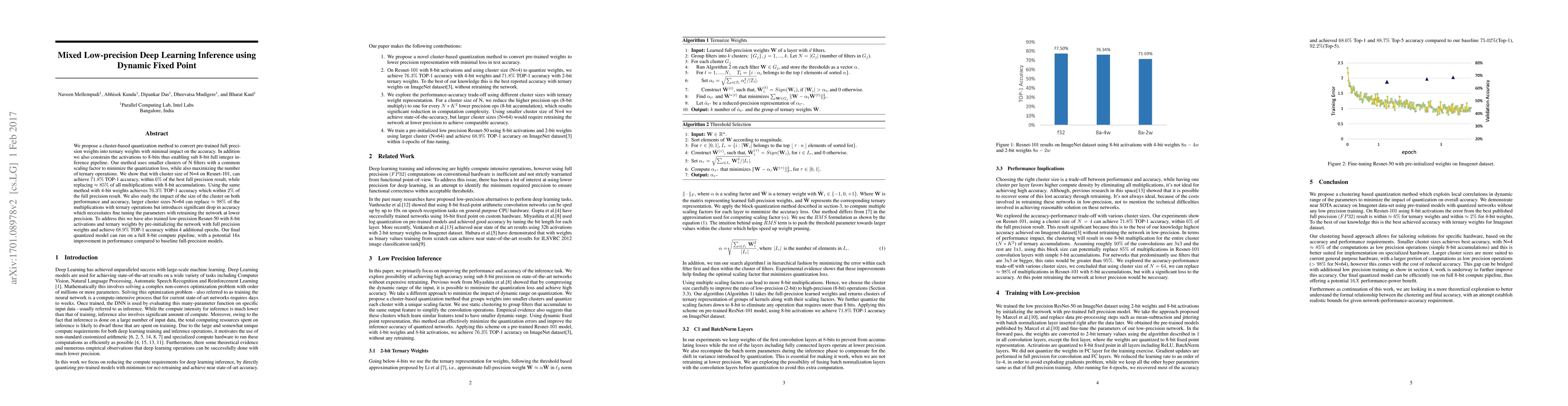 We propose a cluster-based quantization method to convert pre-trained full precision weights into ternary weights with minimal impact on the accuracy. In addition, we also constrain the activations to 8-bits thus enabling sub 8-bit full integer inference pipeline. Our method uses smaller clusters of N filters with a common scaling factor to minimize the quantization loss, while also maximizing the number of ternary operations. We show that with a cluster size of N=4 on Resnet-101, can achieve 71.8% TOP-1 accuracy, within 6% of the best full precision results while replacing ~85% of all multiplications with 8-bit accumulations. Using the same method with 4-bit weights achieves 76.3% TOP-1 accuracy which within 2% of the full precision result. We also study the impact of the size of the cluster on both performance and accuracy, larger cluster sizes N=64 can replace ~98% of the multiplications with ternary operations but introduces significant drop in accuracy which necessitates fine tuning the parameters with retraining the network at lower precision. To address this we have also trained low-precision Resnet-50 with 8-bit activations and ternary weights by pre-initializing the network with full precision weights and achieve 68.9% TOP-1 accuracy within 4 additional epochs. Our final quantized model can run on a full 8-bit compute pipeline, with a potential 16x improvement in performance compared to baseline full-precision models.