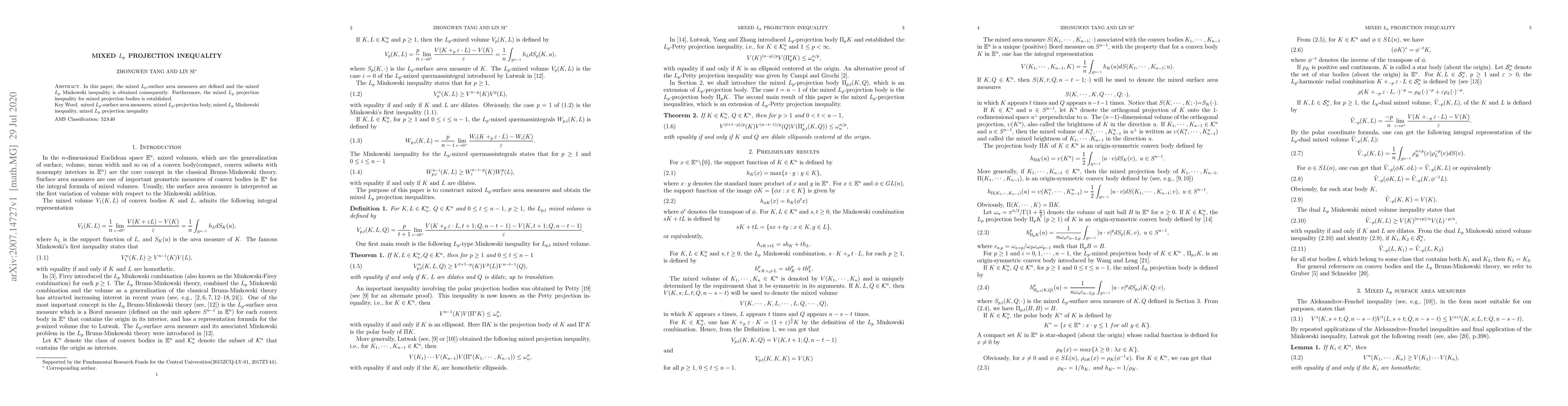 In this paper, the mixed Lp-surface area measures are defined and the mixed Lp Minkowski inequality is obtained consequently. Furthermore, the mixed Lp projection inequality for mixed projection bodies is established.