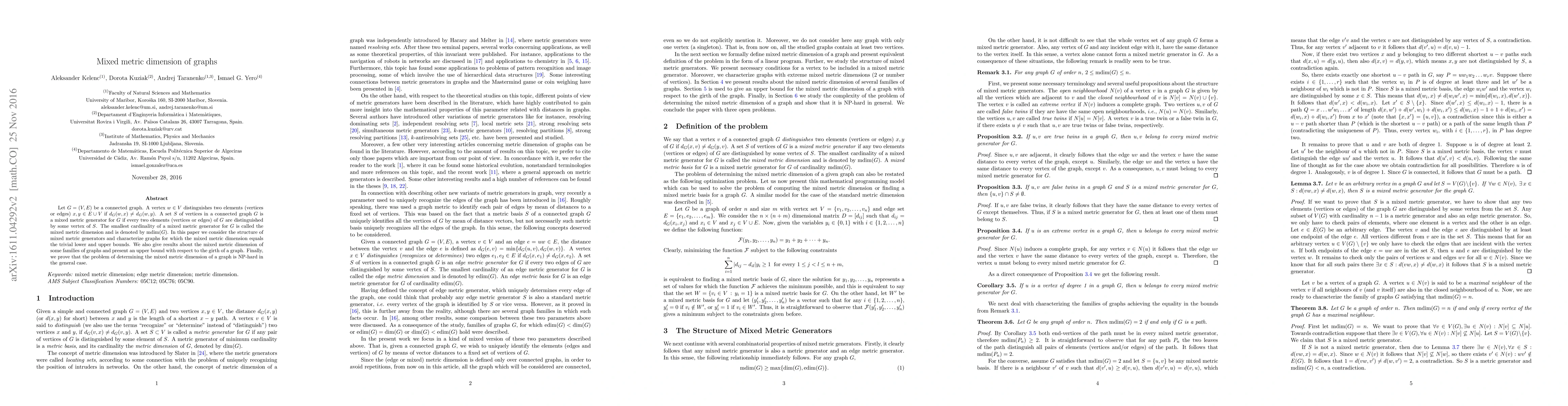 Let $G=(V,E)$ be a connected graph. A vertex $w\in V$ distinguishes two elements (vertices or edges) $x,y\in E\cup V$ if $d_G(w,x)\ne d_G(w,y)$. A set $S$ of vertices in a connected graph $G$ is a mixed metric generator for $G$ if every two elements (vertices or edges) of $G$ are distinguished by some vertex of $S$. The smallest cardinality of a mixed metric generator for $G$ is called the mixed metric dimension and is denoted by $\mathrm{mdim}(G)$. In this paper we consider the structure of mixed metric generators and characterize graphs for which the mixed metric dimension equals the trivial lower and upper bounds. We also give results about the mixed metric dimension of some families of graphs and present an upper bound with respect to the girth of a graph. Finally, we prove that the problem of determining the mixed metric dimension of a graph is NP-hard in the general case.