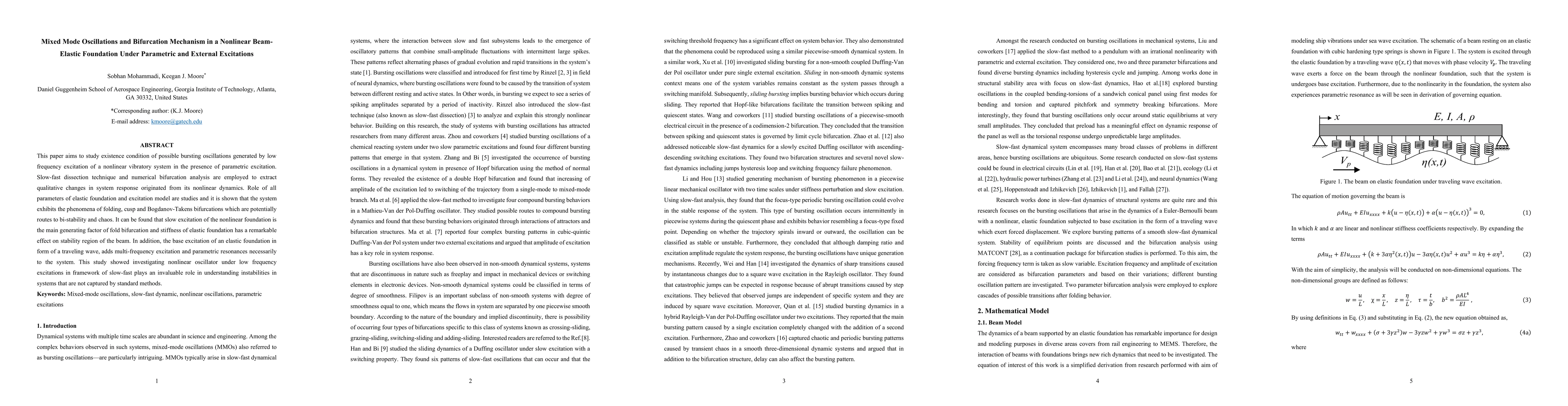 This paper aims to study existence condition of possible bursting oscillations generated by low frequency excitation of a nonlinear vibratory system in the presence of parametric excitation. Slow-fast dissection technique and numerical bifurcation analysis are employed to extract qualitative changes in system response originated from its nonlinear dynamics. Role of all parameters of elastic foundation and excitation model are studies and it is shown that the system exhibits the phenomena of folding, cusp and Bogdanov-Takens bifurcations which are potentially routes to bi-stability and chaos. It can be found that slow excitation of the nonlinear foundation is the main generating factor of fold bifurcation and stiffness of elastic foundation has a remarkable effect on stability region of the beam. In addition, the base excitation of an elastic foundation in form of a traveling wave, adds multi-frequency excitation and parametric resonances necessarily to the system. This study showed investigating nonlinear oscillator under low frequency excitations in framework of slow-fast plays an invaluable role in understanding instabilities in systems that are not captured by standard methods.