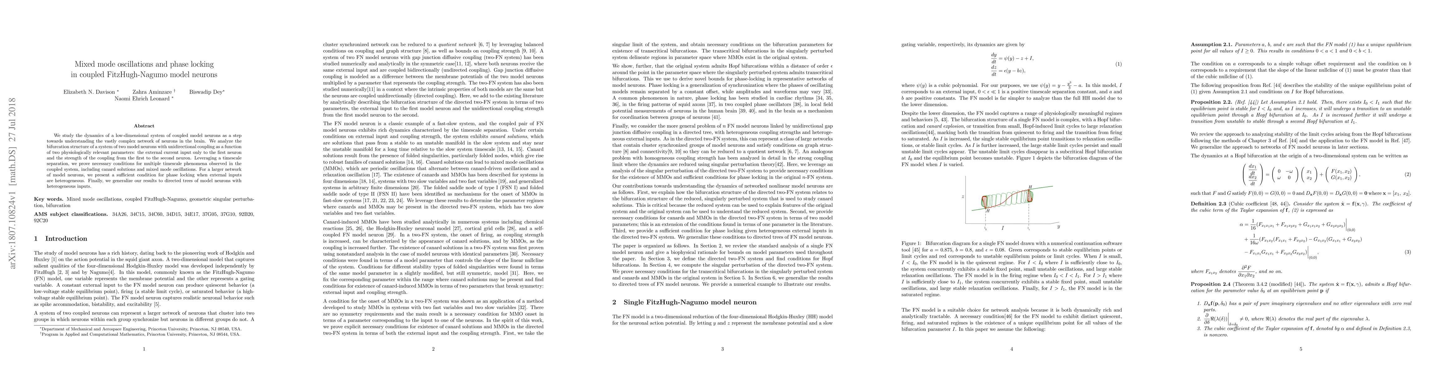 We study the dynamics of a low-dimensional system of coupled model neurons as a step towards understanding the vastly complex network of neurons in the brain. We analyze the bifurcation structure of a system of two model neurons with unidirectional coupling as a function of two physiologically relevant parameters: the external current input only to the first neuron and the strength of the coupling from the first to the second neuron. Leveraging a timescale separation, we prove necessary conditions for multiple timescale phenomena observed in the coupled system, including canard solutions and mixed mode oscillations. For a larger network of model neurons, we present a sufficient condition for phase locking when external inputs are heterogeneous. Finally, we generalize our results to directed trees of model neurons with heterogeneous inputs.