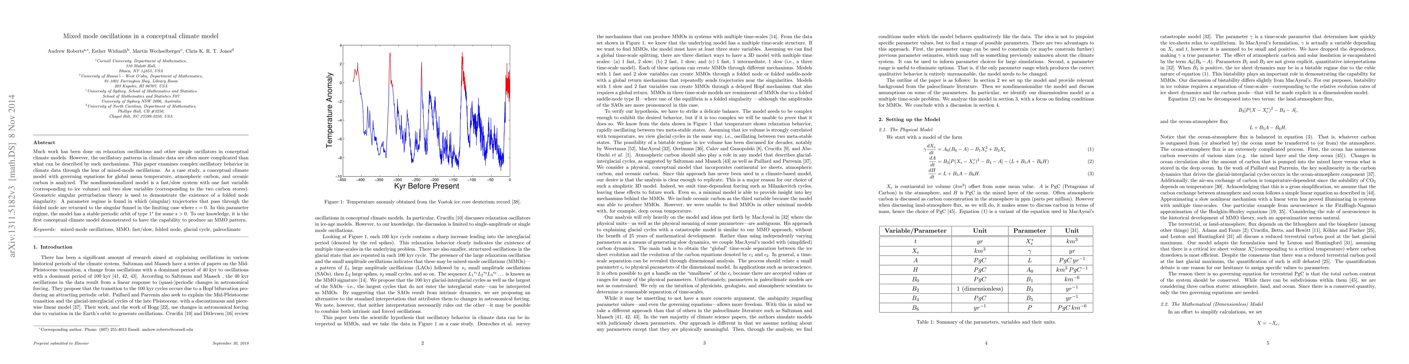 This paper investigates complex oscillatory behavior in a conceptual climate model using mixed-mode oscillations, demonstrating the existence of a folded node singularity and a stable periodic orbit. The model, featuring fast ice volume and slow carbon store dynamics, is the first of its kind shown to exhibit MMO patterns.