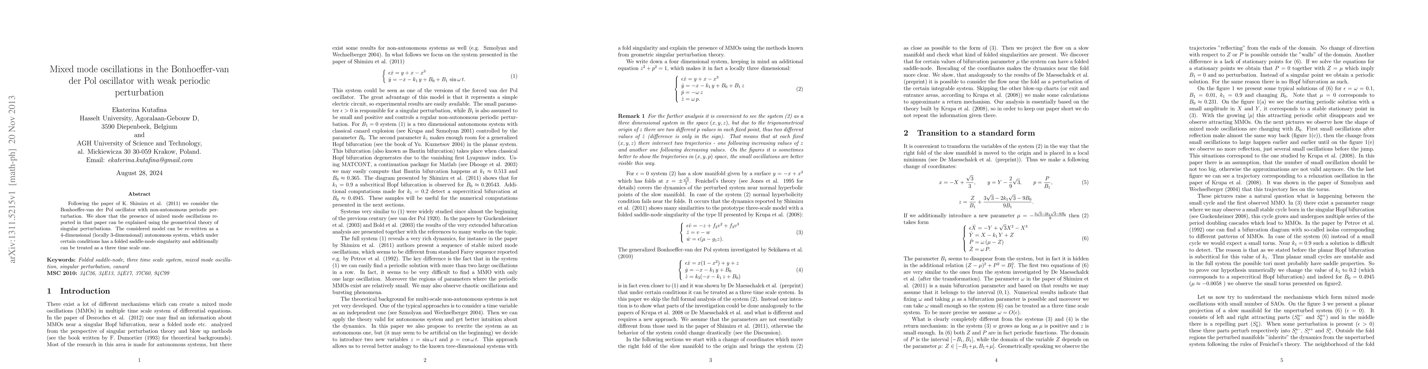 Following the paper of K. Shimizu et al. (2011) we consider the Bonhoeffer-van der Pol oscillator with non-autonomous periodic perturbation. We show that the presence of mixed mode oscillations reported in that paper can be explained using the geometrical theory of singular perturbations. The considered model can be re-written as a 4-dimensional (locally 3-dimensional) autonomous system, which under certain conditions has a folded saddle-node singularity and additionally can be treated as a three time scale one.