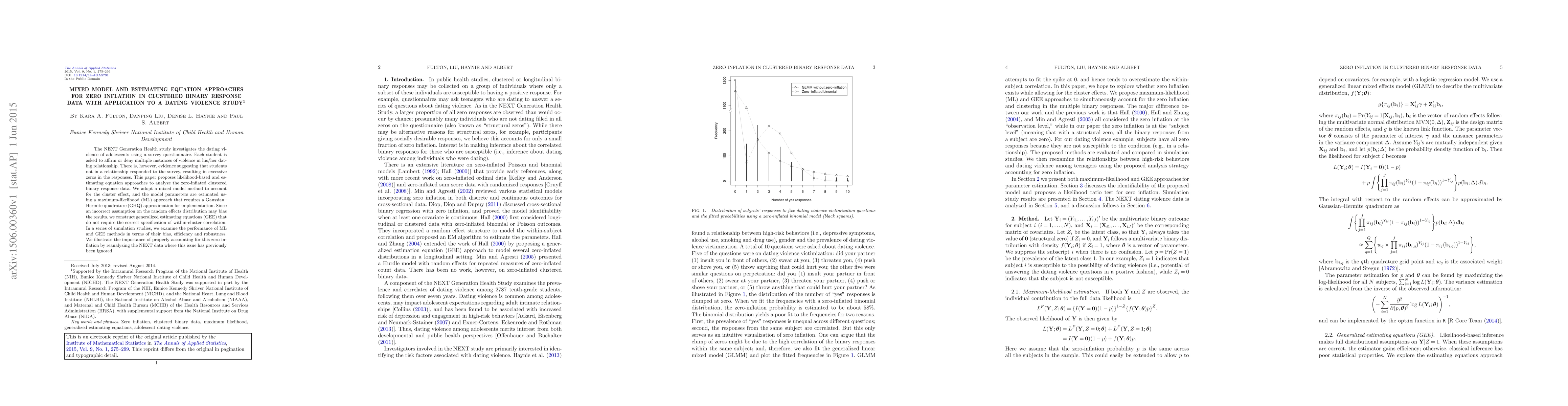 The NEXT Generation Health study investigates the dating violence of adolescents using a survey questionnaire. Each student is asked to affirm or deny multiple instances of violence in his/her dating relationship. There is, however, evidence suggesting that students not in a relationship responded to the survey, resulting in excessive zeros in the responses. This paper proposes likelihood-based and estimating equation approaches to analyze the zero-inflated clustered binary response data. We adopt a mixed model method to account for the cluster effect, and the model parameters are estimated using a maximum-likelihood (ML) approach that requires a Gaussian-Hermite quadrature (GHQ) approximation for implementation. Since an incorrect assumption on the random effects distribution may bias the results, we construct generalized estimating equations (GEE) that do not require the correct specification of within-cluster correlation. In a series of simulation studies, we examine the performance of ML and GEE methods in terms of their bias, efficiency and robustness. We illustrate the importance of properly accounting for this zero inflation by reanalyzing the NEXT data where this issue has previously been ignored.