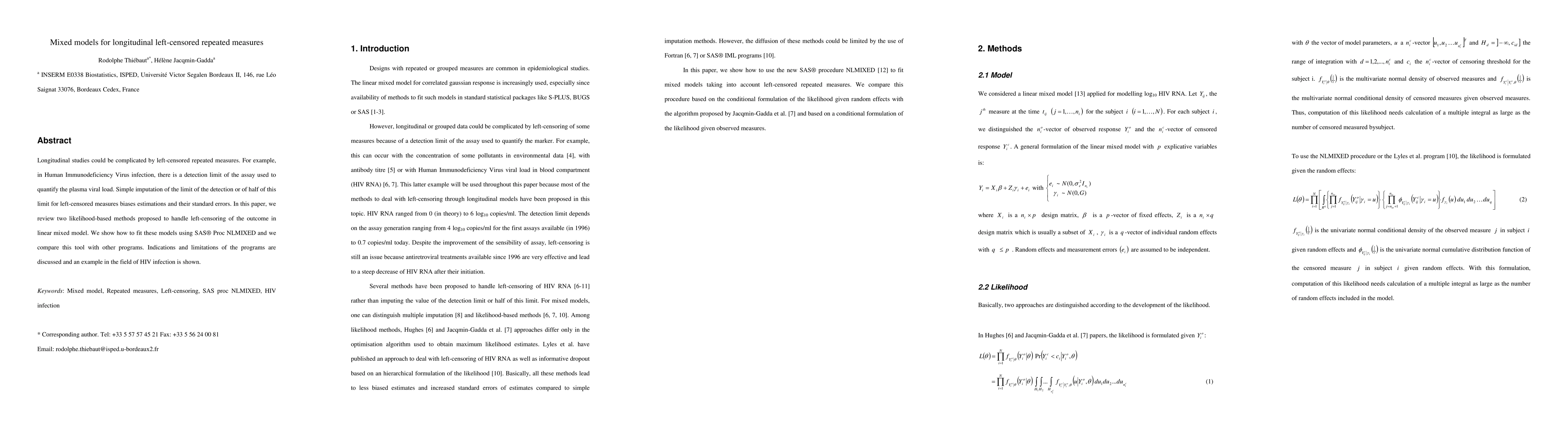 This paper reviews two likelihood-based methods for handling left-censored repeated measures in linear mixed models, demonstrating their implementation using SAS Proc NLMIXED and comparing it with other programs. An example from HIV infection illustrates the methods, highlighting their advantages and limitations.