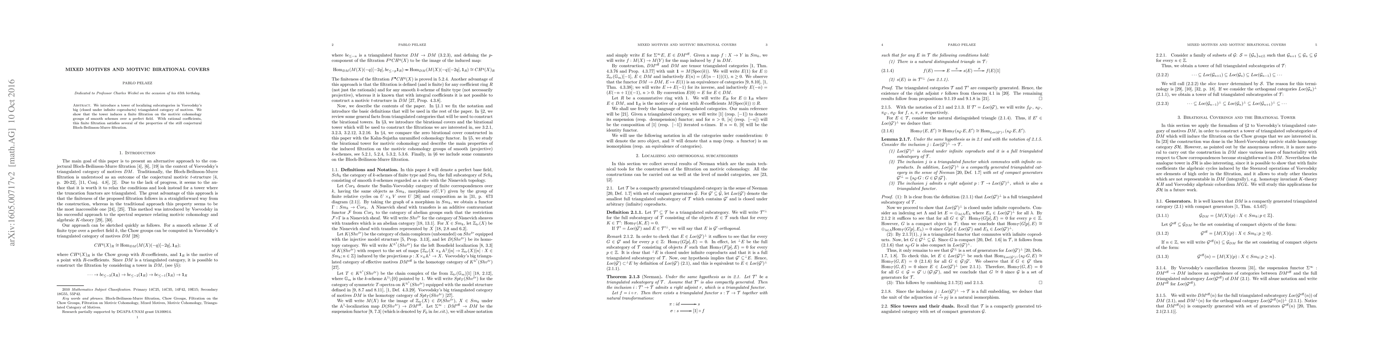 The paper introduces a tower of localizing subcategories in Voevodsky's triangulated category of motives, which induces a finite filtration on motivic cohomology groups resembling conjectured properties of the Bloch-Beilinson-Murre filtration. The focus is on smooth schemes over perfect fields with rational coefficients.