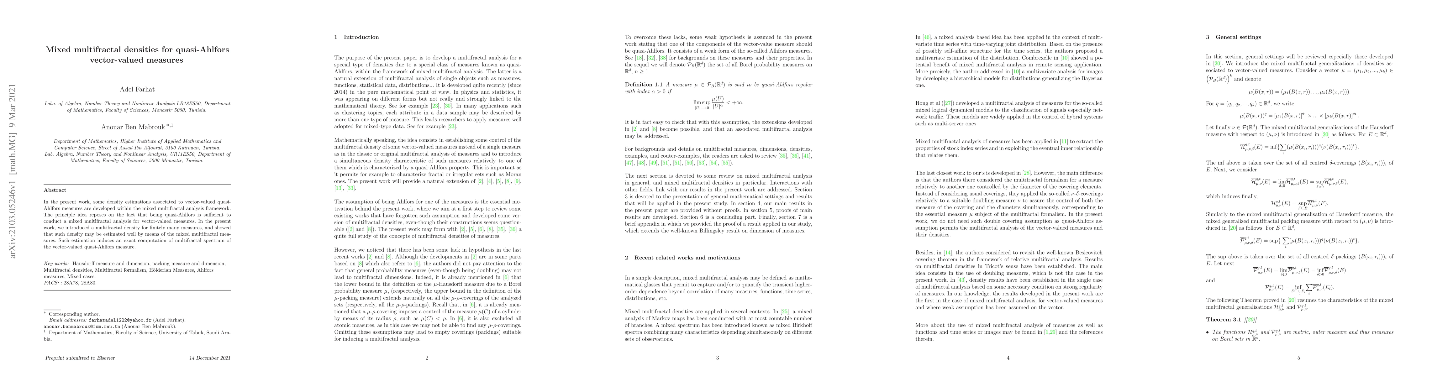 This paper develops density estimations for quasi-Ahlfors vector-valued measures using mixed multifractal analysis, introducing a multifractal density for finitely many measures and demonstrating its precise computation via mixed multifractal measures.