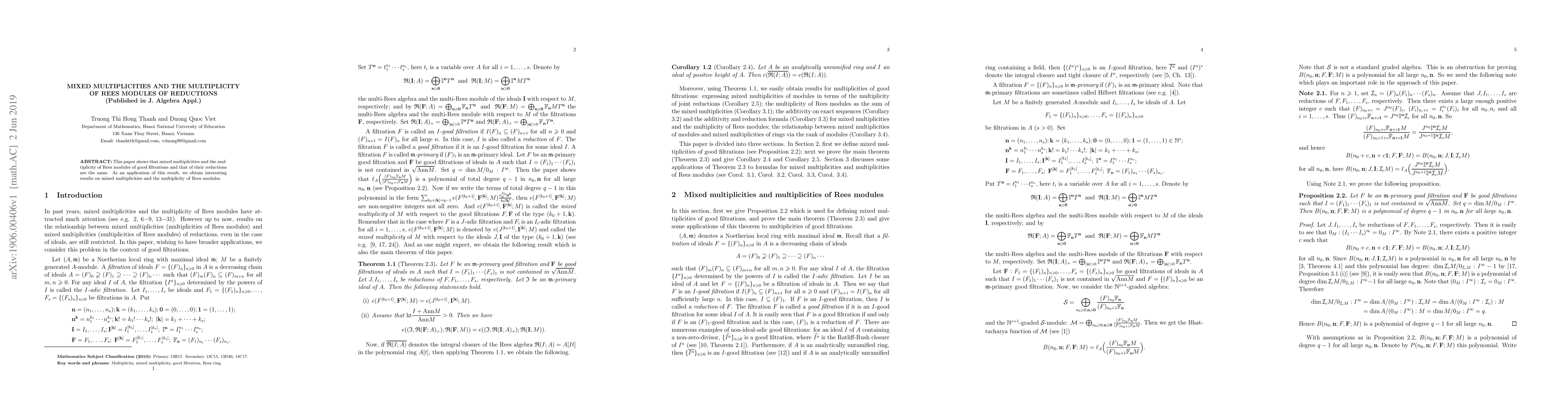 The paper shows that mixed multiplicities of good filtrations and their reductions are equal, leading to interesting results on mixed multiplicities and Rees modules.