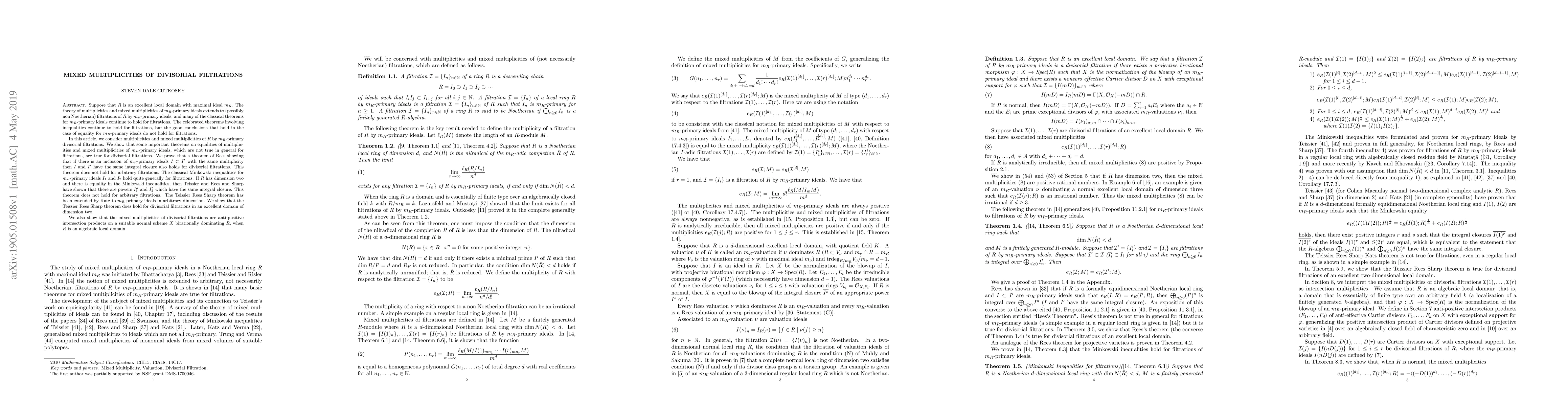 Suppose that $R$ is an excellent local domain with maximal ideal $m_R$. The theory of multiplicities and mixed multiplicities of $m_R$-primary ideals extends to (possibly non Noetherian) filtrations of $R$ by $m_R$-primary ideals, and many of the classical theorems for $m_R$-primary ideals continue to hold for filtrations. The celebrated theorems involving inequalities continue to hold for filtrations, but the good conclusions that hold in the case of equality for $m_R$-primary ideals do not hold for filtrations. In this article, we consider multiplicities and mixed multiplicities of $R$ by $m_R$-primary divisorial filtrations. We show that some important theorems on equalities of multiplicities and mixed multiplicities of $m_R$-primary ideals, which are not true in general for filtrations, are true for divisorial filtrations. We prove that a theorem of Rees showing that if there is an inclusion of $m_R$-primary ideals $I\subset I'$ with the same multiplicity then $I$ and $I'$ have the same integral closure also holds for divisorial filtrations. This theorem does not hold for arbitrary filtrations. We show that the Teissier Rees Sharp Katz theorem on equality in the Minkowski inequality holds for divisorial filtrations in an excellent domain of dimension two. We also show that the mixed multiplicities of divisorial filtrations are anti-positive intersection products on a suitable normal scheme $X$ birationally dominating $R$, when $R$ is an algebraic local domain.