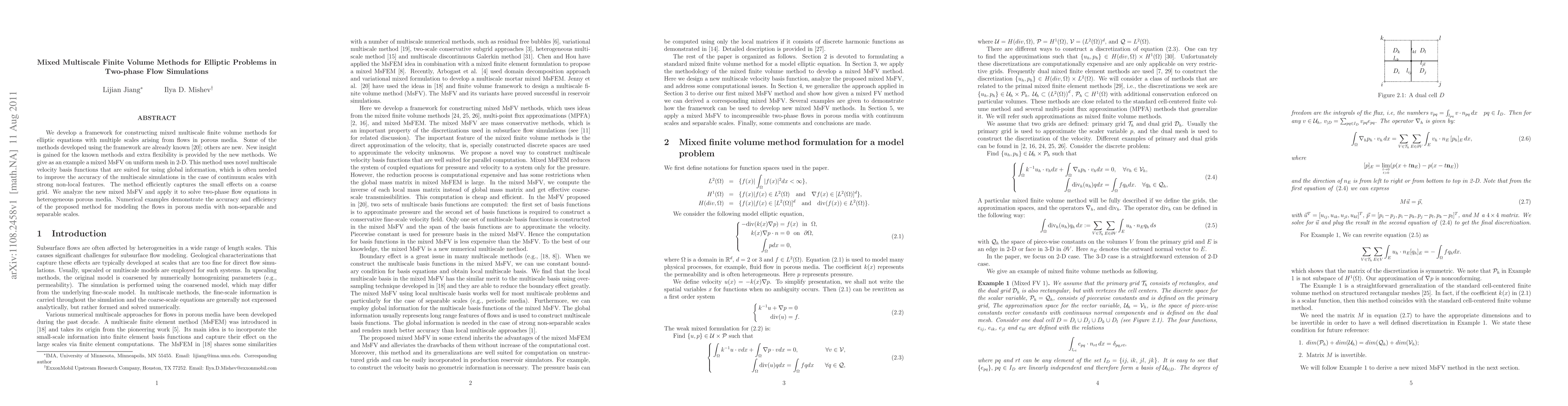 This paper presents a mixed multiscale finite volume method framework for solving elliptic equations in two-phase flow simulations in porous media, introducing both new and improved methods. The proposed mixed MsFV method on uniform meshes uses novel multiscale velocity basis functions to capture small effects efficiently on a coarse grid, demonstrating accuracy and efficiency in numerical examples.