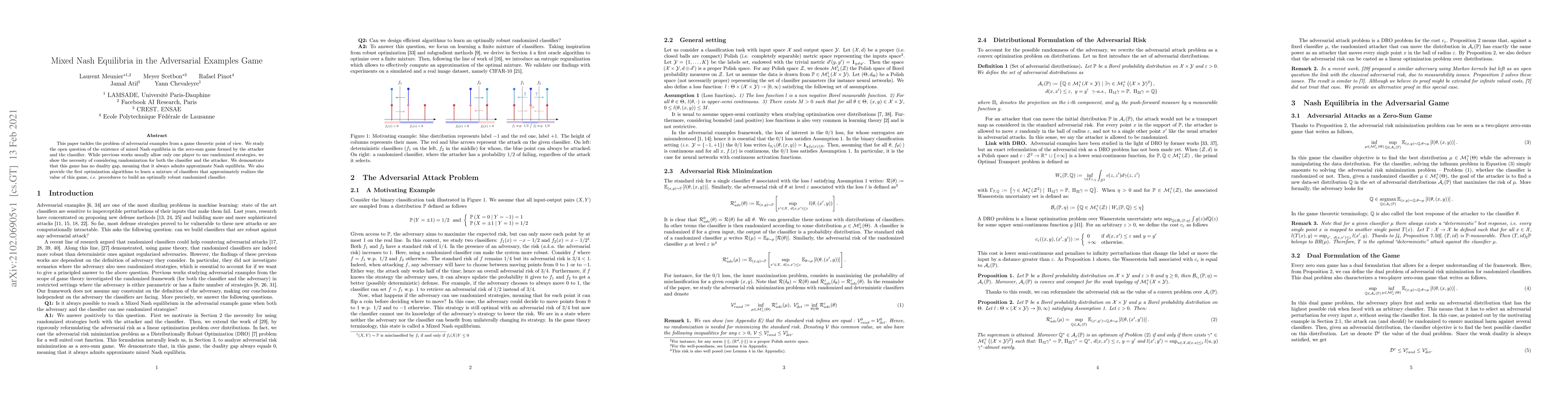 This paper tackles the problem of adversarial examples from a game theoretic point of view. We study the open question of the existence of mixed Nash equilibria in the zero-sum game formed by the attacker and the classifier. While previous works usually allow only one player to use randomized strategies, we show the necessity of considering randomization for both the classifier and the attacker. We demonstrate that this game has no duality gap, meaning that it always admits approximate Nash equilibria. We also provide the first optimization algorithms to learn a mixture of classifiers that approximately realizes the value of this game, \emph{i.e.} procedures to build an optimally robust randomized classifier.