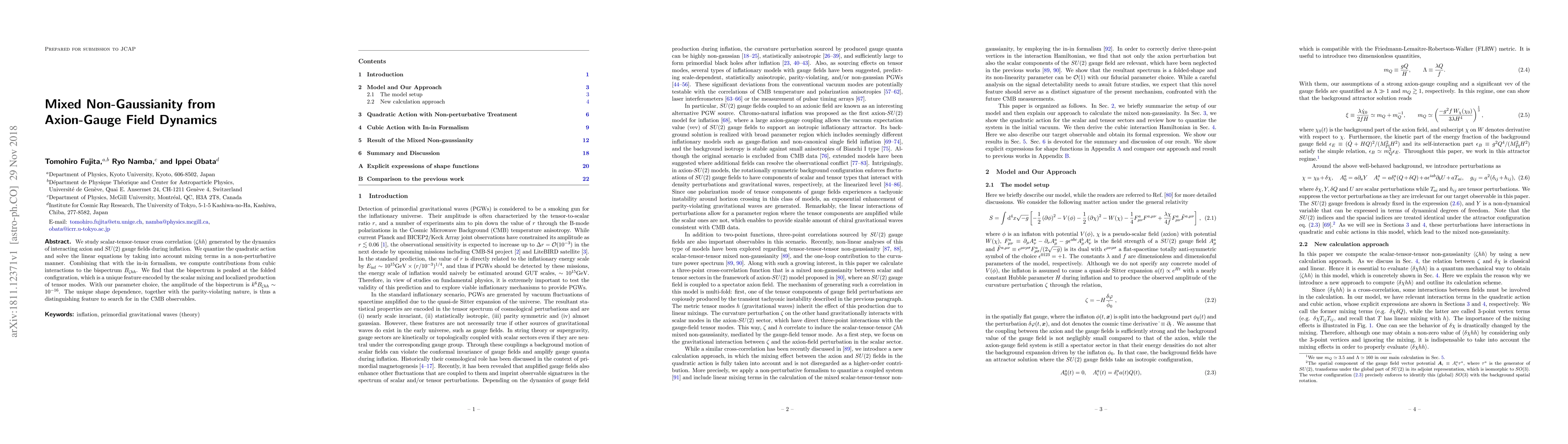 We study scalar-tensor-tensor cross correlation $\langle \zeta hh \rangle$ generated by the dynamics of interacting axion and SU(2) gauge fields during inflation. We quantize the quadratic action and solve the linear equations by taking into account mixing terms in a non-perturbative manner. Combining that with the in-in formalism, we compute contributions from cubic interactions to the bispectrum $B_{\zeta hh}$. We find that the bispectrum is peaked at the folded configuration, which is a unique feature encoded by the scalar mixing and localized production of tensor modes. With our parameter choice, the amplitude of the bispectrum is $k^6 B_{\zeta hh} \sim 10^{-16}$. The unique shape dependence, together with the parity-violating nature, is thus a distinguishing feature to search for in the CMB observables.
