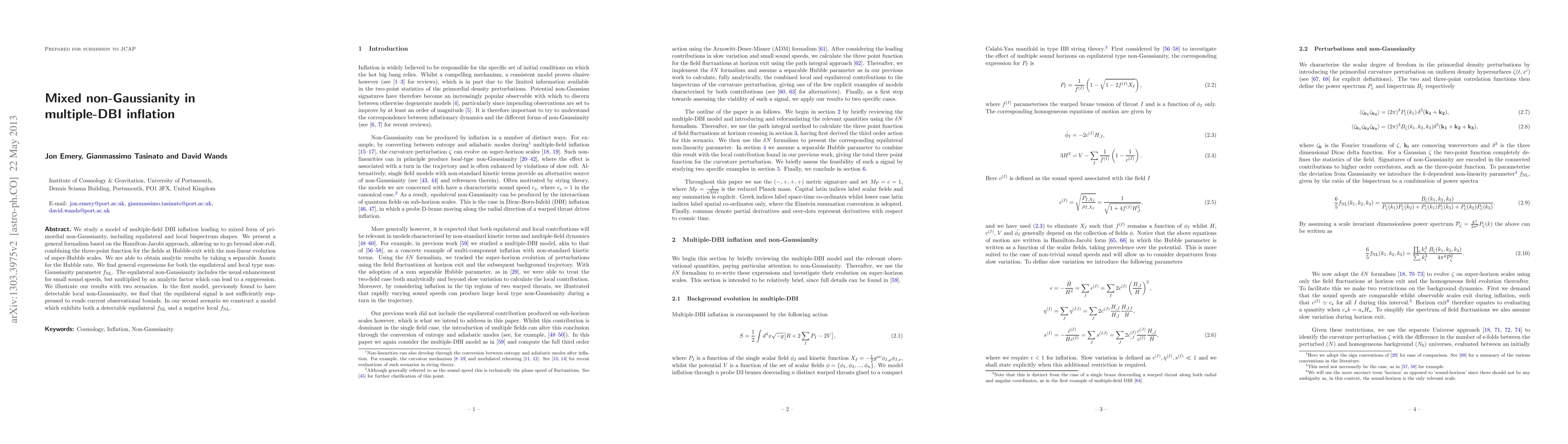 We study a model of multiple-field DBI inflation leading to mixed form of primordial non-Gaussianity, including equilateral and local bispectrum shapes. We present a general formalism based on the Hamilton-Jacobi approach, allowing us to go beyond slow-roll, combining the three-point function for the fields at Hubble-exit with the non-linear evolution of super-Hubble scales. We are able to obtain analytic results by taking a separable Ansatz for the Hubble rate. We find general expressions for both the equilateral and local type non-Gaussianity parameter fNL. The equilateral non-Gaussianity includes the usual enhancement for small sound speeds, but multiplied by an analytic factor which can lead to a suppression. We illustrate our results with two scenarios. In the first model, previously found to have detectable local non-Gaussianity, we find that the equilateral signal is not sufficiently suppressed to evade current observational bounds. In our second scenario we construct a model which exhibits both a detectable equilateral fNL and a negative local fNL.