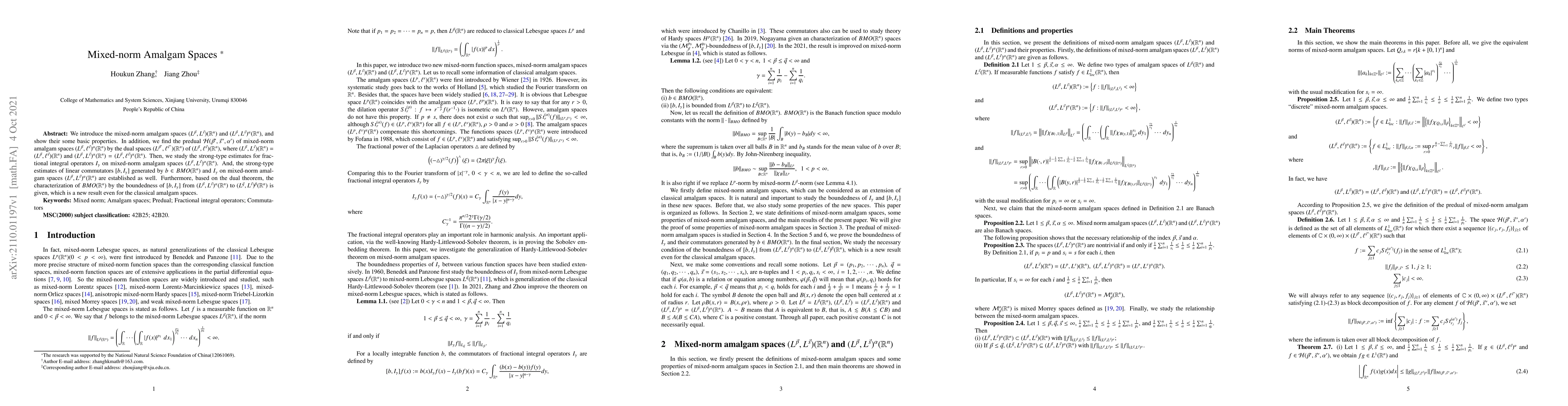 This paper introduces mixed-norm amalgam spaces $(L^{\vec{p}},L^{\vec{s}})^{\alpha}(\mathbb{R}^n)$ and establishes their basic properties, including finding their predual $\mathcal{H}(\vec{p}',\vec{s}\,',\alpha')$. It also investigates strong-type estimates for fractional integral operators and their commutators on these spaces, leading to a new characterization of $BMO(\mathbb{R}^n)$.