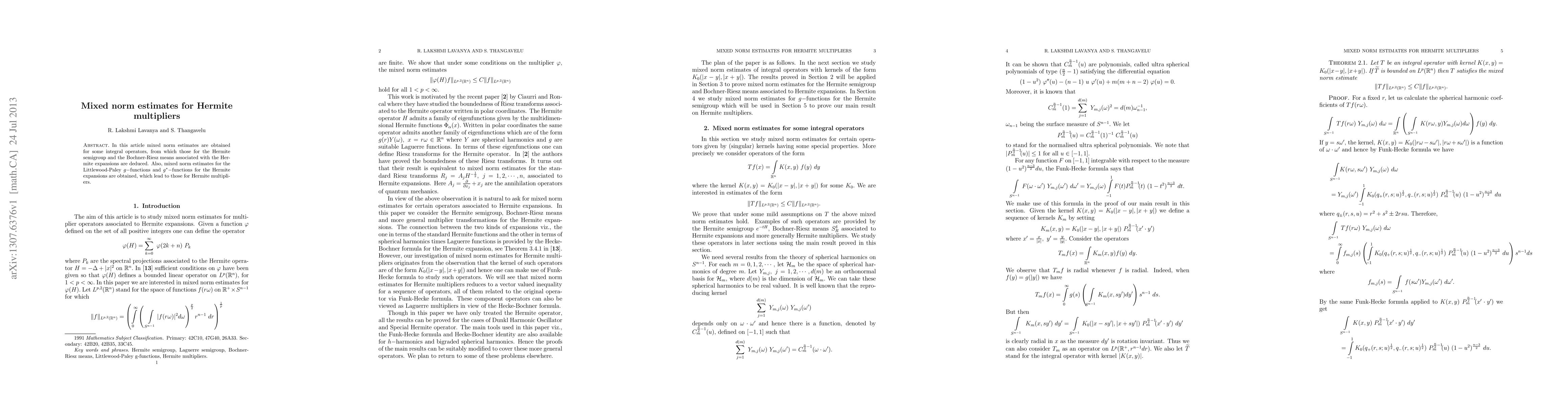 This paper establishes mixed norm estimates for integral operators, deriving results for Hermite semigroups, Bochner Riesz means, and Littlewood Paley g functions, ultimately leading to mixed norm estimates for Hermite multipliers.