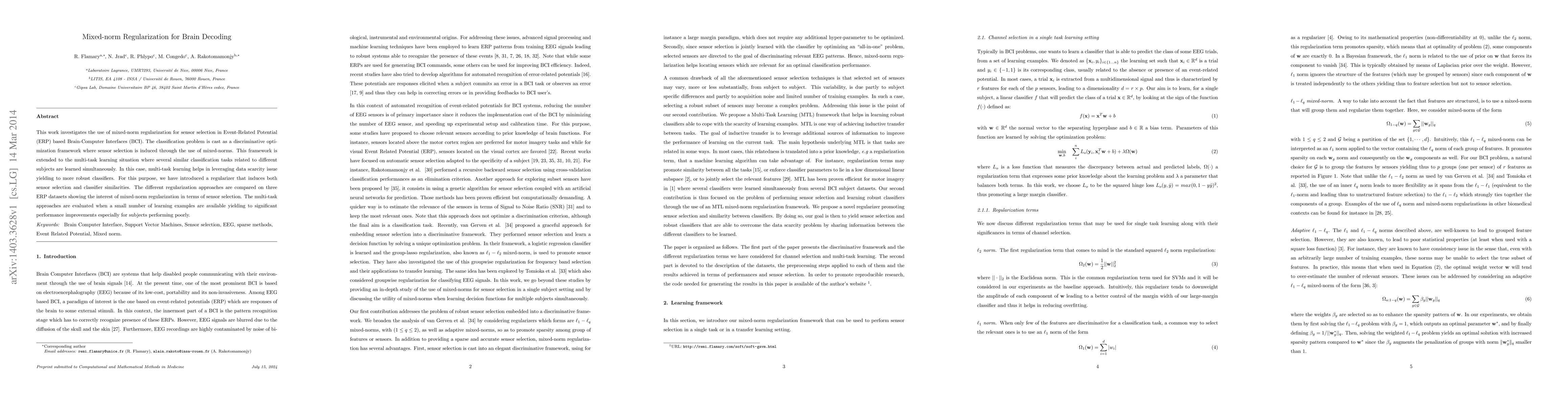 This paper introduces mixed-norm regularization for brain decoding in Event-Related Potential (ERP) based Brain-Computer Interfaces, showing improved performance with multi-task learning and robust sensor selection.