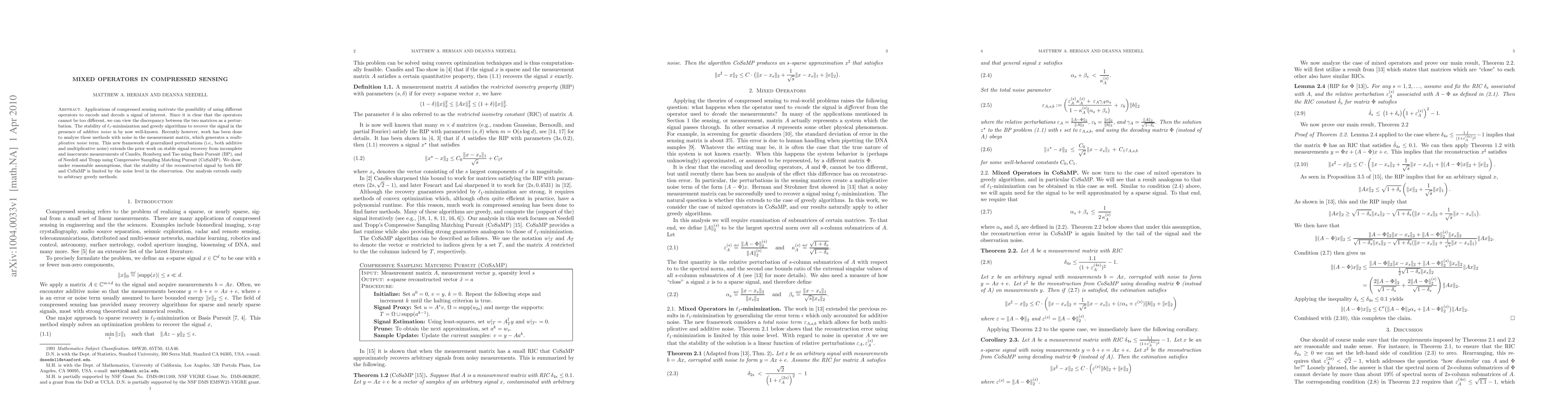 Applications of compressed sensing motivate the possibility of using different operators to encode and decode a signal of interest. Since it is clear that the operators cannot be too different, we can view the discrepancy between the two matrices as a perturbation. The stability of L1-minimization and greedy algorithms to recover the signal in the presence of additive noise is by now well-known. Recently however, work has been done to analyze these methods with noise in the measurement matrix, which generates a multiplicative noise term. This new framework of generalized perturbations (i.e., both additive and multiplicative noise) extends the prior work on stable signal recovery from incomplete and inaccurate measurements of Candes, Romberg and Tao using Basis Pursuit (BP), and of Needell and Tropp using Compressive Sampling Matching Pursuit (CoSaMP). We show, under reasonable assumptions, that the stability of the reconstructed signal by both BP and CoSaMP is limited by the noise level in the observation. Our analysis extends easily to arbitrary greedy methods.