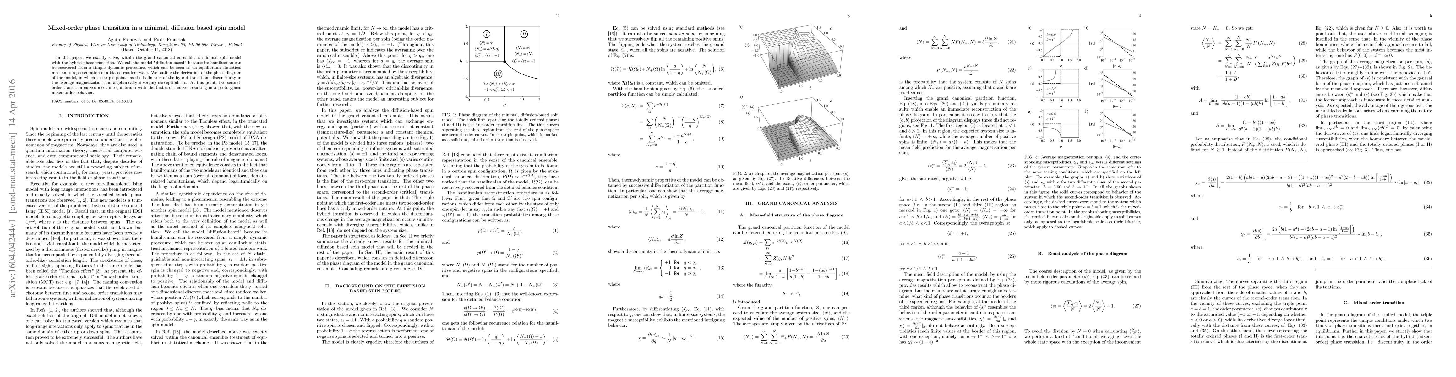This paper exactly solves a minimal spin model within the grand canonical ensemble, revealing a mixed-order phase transition characterized by a triple point where two second-order and one first-order transition curves converge, marked by a discontinuity in magnetization and algebraically diverging susceptibilities. The model is termed "diffusion-based" due to its Hamiltonian derived from a biased random walk.