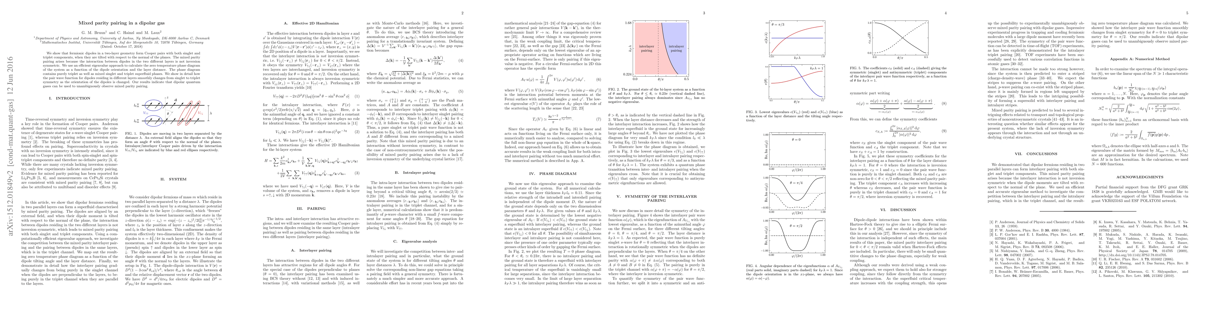 We show that fermionic dipoles in a two-layer geometry form Cooper pairs with both singlet and triplet components, when they are tilted with respect to the normal of the planes. The mixed parity pairing arises because the interaction between dipoles in the two different layers is not inversion symmetric. We use an efficient eigenvalue approach to calculate the zero temperature phase diagram of the system as a function of the dipole orientation and the layer distance. The phase diagram contains purely triplet as well as mixed singlet and triplet superfluid phases. We show in detail how the pair wave function for dipoles residing in different layers smoothly changes from singlet to triplet symmetry as the orientation of the dipoles is changed. Our results indicate that dipolar quantum gases can be used to unambiguously observe mixed parity pairing.