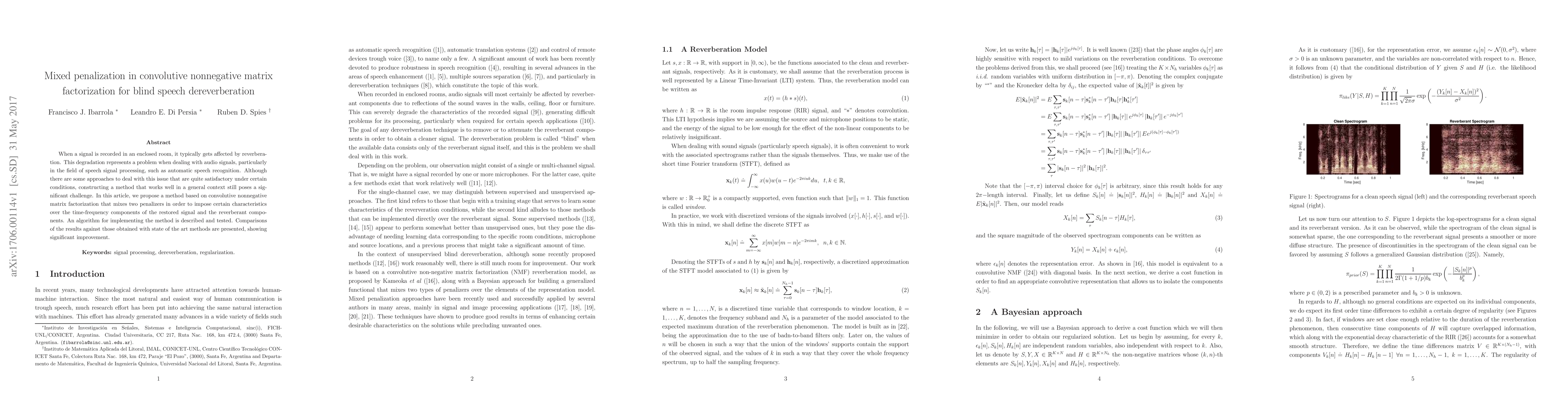 When a signal is recorded in an enclosed room, it typically gets affected by reverberation. This degradation represents a problem when dealing with audio signals, particularly in the field of speech signal processing, such as automatic speech recognition. Although there are some approaches to deal with this issue that are quite satisfactory under certain conditions, constructing a method that works well in a general context still poses a significant challenge. In this article, we propose a method based on convolutive nonnegative matrix factorization that mixes two penalizers in order to impose certain characteristics over the time-frequency components of the restored signal and the reverberant components. An algorithm for implementing the method is described and tested. Comparisons of the results against those obtained with state of the art methods are presented, showing significant improvement.