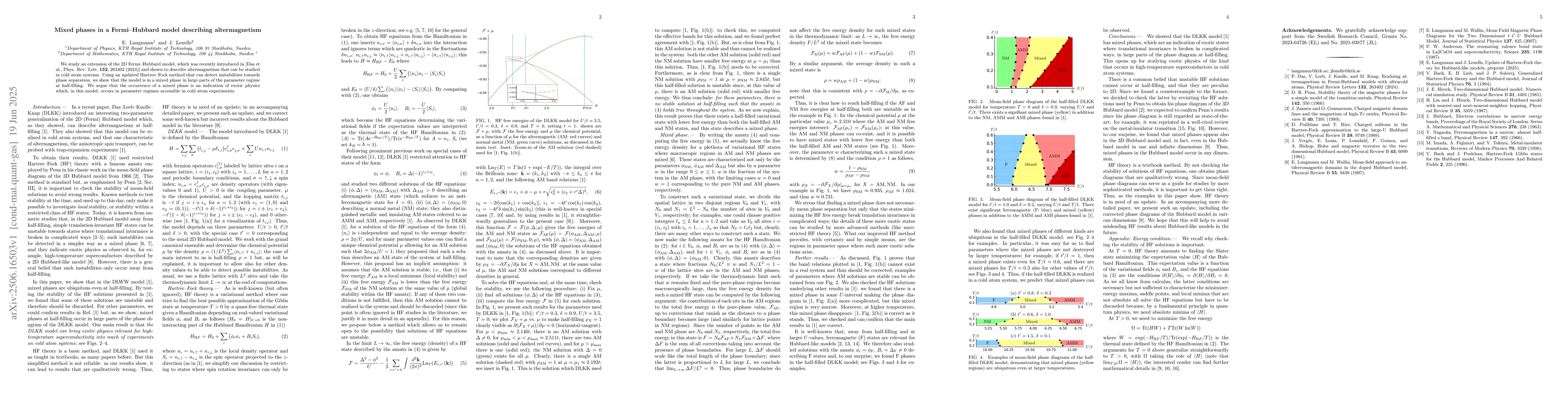 We study an extension of the 2D Fermi--Hubbard model, which was recently introduced in [Das et al., Phys. Rev. Lett. 132, 263402 (2024)] and shown to describe altermagnetism that can be studied in cold atom systems. Using an updated Hartree--Fock method that can detect instabilities towards phase separation, we show that the model is in a mixed phase in large parts of the parameter regime at half-filling. We argue that the occurrence of a mixed phase is an indication of exotic physics which, in this model, occurs in parameter regimes accessible in cold atom experiments.