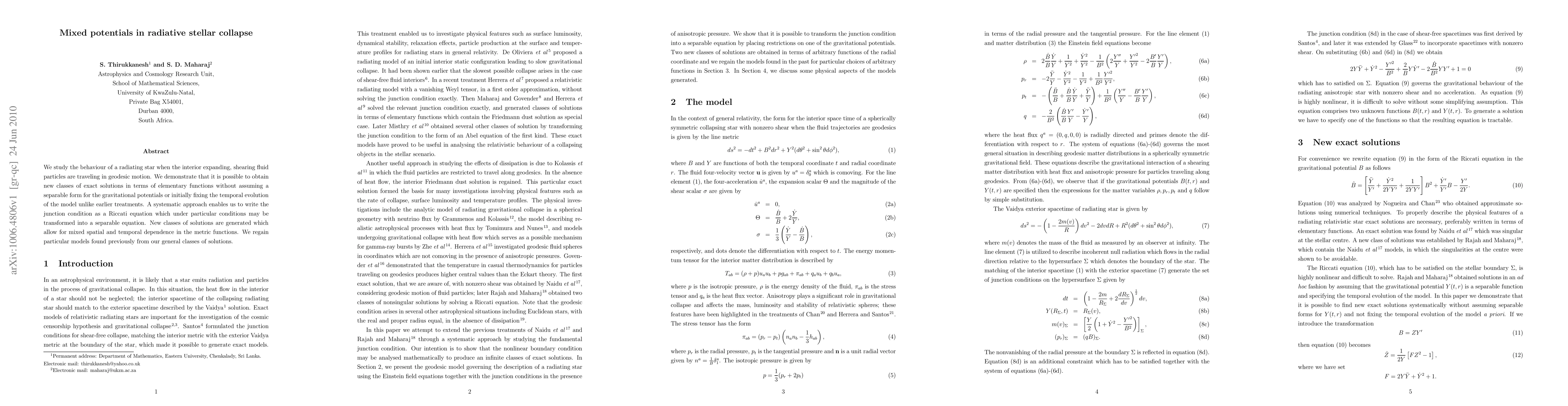 We study the behaviour of a radiating star when the interior expanding, shearing fluid particles are traveling in geodesic motion. We demonstrate that it is possible to obtain new classes of exact solutions in terms of elementary functions without assuming a separable form for the gravitational potentials or initially fixing the temporal evolution of the model unlike earlier treatments. A systematic approach enables us to write the junction condition as a Riccati equation which under particular conditions may be transformed into a separable equation. New classes of solutions are generated which allow for mixed spatial and temporal dependence in the metric functions. We regain particular models found previously from our general classes of solutions.