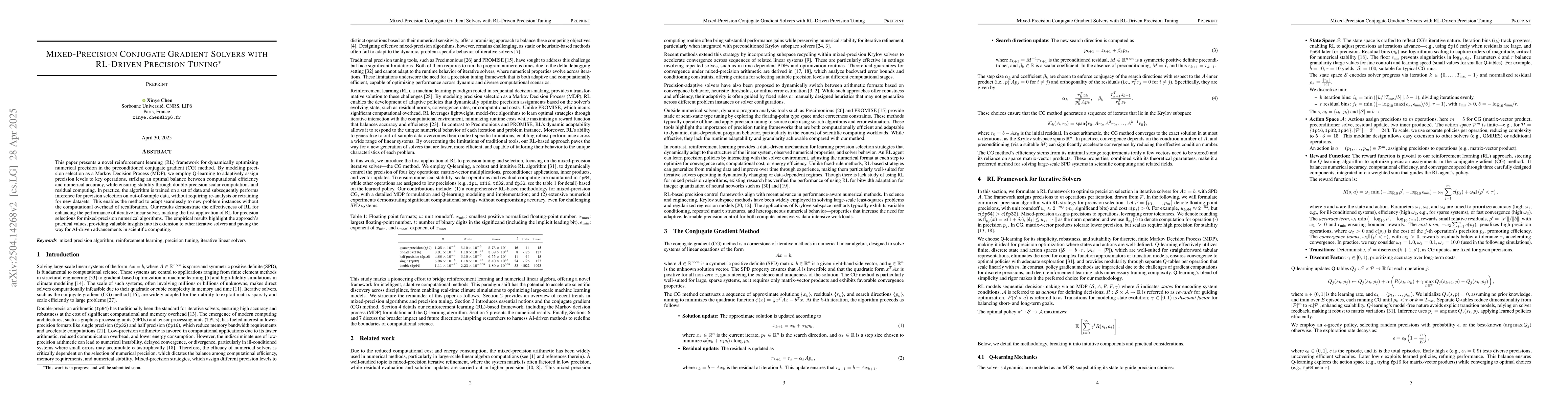 A novel reinforcement learning framework optimizes numerical precision in preconditioned conjugate gradient methods for better performance and scalability, marking the first application of RL to mixed-precision numerical methods.