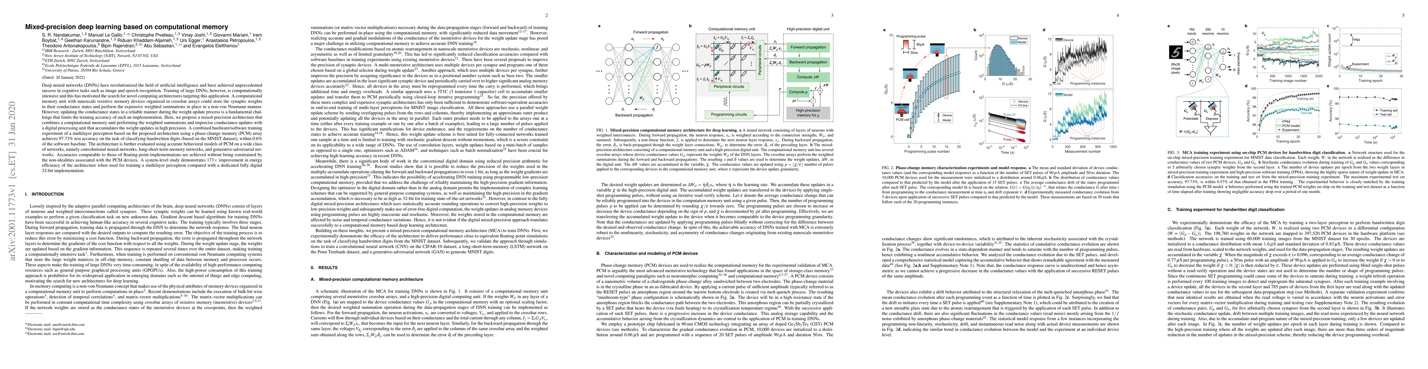 This paper proposes a mixed-precision deep learning architecture that integrates computational memory units with digital processing units to enhance training efficiency and accuracy. The approach achieves high energy efficiency and maintains performance comparable to floating-point implementations, demonstrating significant improvements in training tasks for various neural network types.
