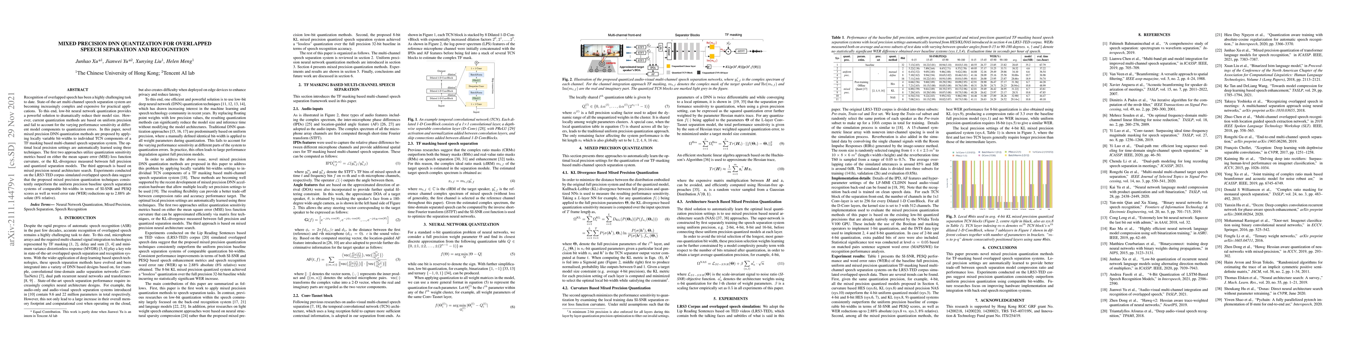 This paper proposes mixed precision DNN quantization methods for multi-channel speech separation, applying variable bit-widths to TCN components. The optimal precision settings are learned using MSE loss curvature, KL-divergence, and neural architecture search, achieving better performance than uniform quantization baselines.