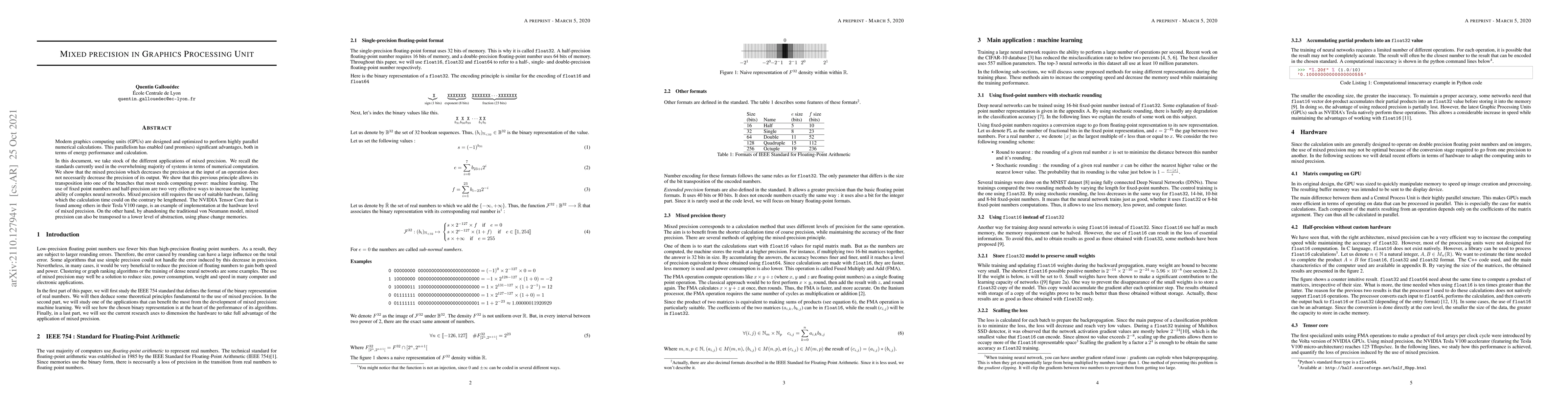 Modern graphics computing units (GPUs) are designed and optimized to perform highly parallel numerical calculations. This parallelism has enabled (and promises) significant advantages, both in terms of energy performance and calculation. In this document, we take stock of the different applications of mixed precision. We recall the standards currently used in the overwhelming majority of systems in terms of numerical computation. We show that the mixed precision which decreases the precision at the input of an operation does not necessarily decrease the precision of its output. We show that this previous principle allows its transposition into one of the branches that most needs computing power: machine learning. The use of fixed point numbers and half-precision are two very effective ways to increase the learning ability of complex neural networks. Mixed precision still requires the use of suitable hardware, failing which the calculation time could on the contrary be lengthened. The NVIDIA Tensor Core that is found among others in their Tesla V100 range, is an example of implementation at the hardware level of mixed precision. On the other hand, by abandoning the traditional von Neumann model, mixed precision can also be transposed to a lower level of abstraction, using phase change memories.