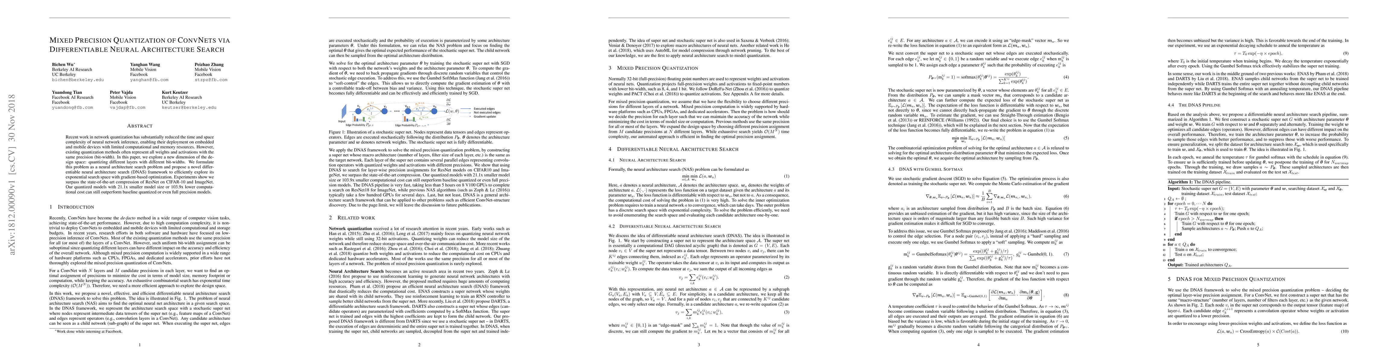 This paper proposes a differentiable neural architecture search (DNAS) framework for mixed precision quantization of convolutional neural networks (ConvNets), allowing different layers to use different bit-widths. The approach achieves state-of-the-art compression and performance on CIFAR-10 and ImageNet, demonstrating significant reductions in model size and computational cost while maintaining or surpassing baseline performance.