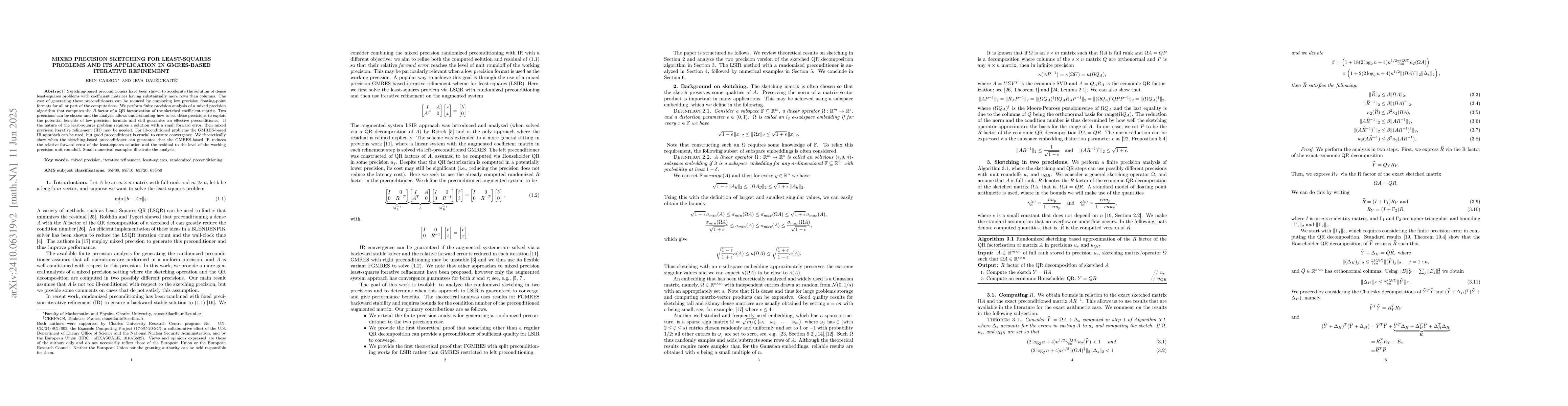 The paper proposes a mixed precision sketching algorithm to efficiently solve dense least-squares problems by reducing the cost of preconditioners through low precision computations. It theoretically demonstrates how to set different precisions to balance accuracy and performance, and shows that GMRES-based iterative refinement can reduce errors to the level of working precision, especially for ill-conditioned problems.