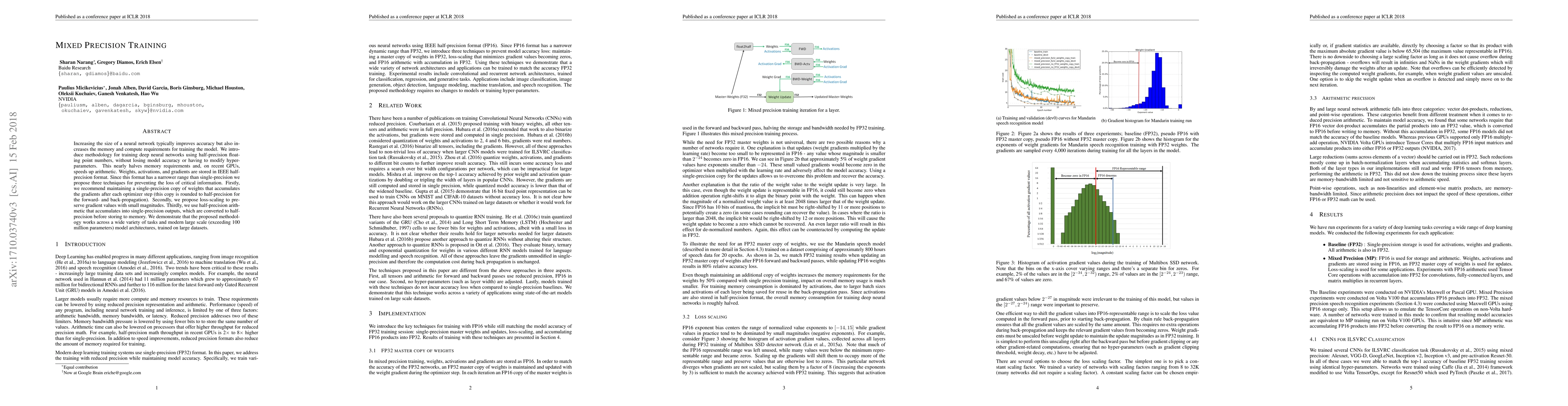 Deep neural networks have enabled progress in a wide variety of applications. Growing the size of the neural network typically results in improved accuracy. As model sizes grow, the memory and compute requirements for training these models also increases. We introduce a technique to train deep neural networks using half precision floating point numbers. In our technique, weights, activations and gradients are stored in IEEE half-precision format. Half-precision floating numbers have limited numerical range compared to single-precision numbers. We propose two techniques to handle this loss of information. Firstly, we recommend maintaining a single-precision copy of the weights that accumulates the gradients after each optimizer step. This single-precision copy is rounded to half-precision format during training. Secondly, we propose scaling the loss appropriately to handle the loss of information with half-precision gradients. We demonstrate that this approach works for a wide variety of models including convolution neural networks, recurrent neural networks and generative adversarial networks. This technique works for large scale models with more than 100 million parameters trained on large datasets. Using this approach, we can reduce the memory consumption of deep learning models by nearly 2x. In future processors, we can also expect a significant computation speedup using half-precision hardware units.