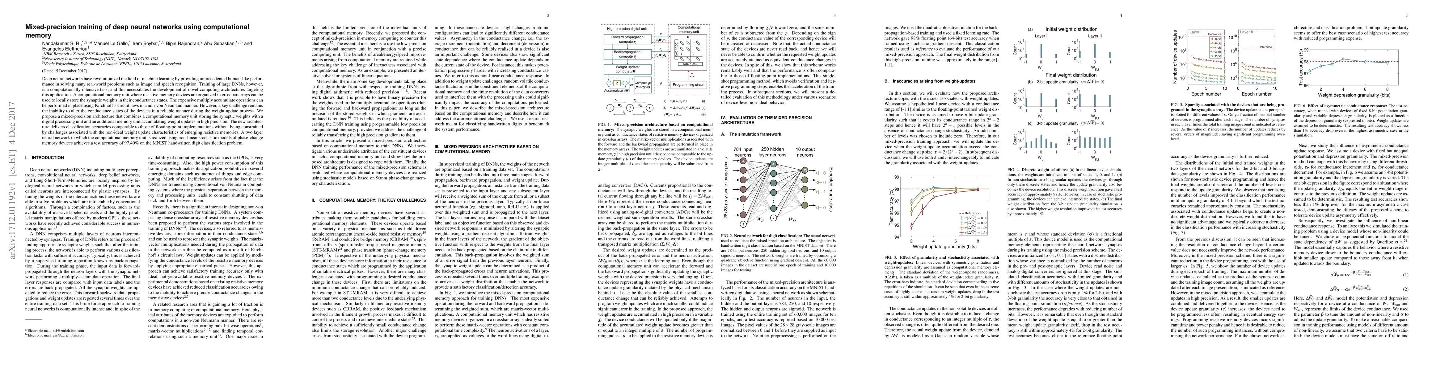 This paper proposes a mixed-precision training architecture for deep neural networks that integrates a computational memory unit with resistive memory devices and a digital processing unit. The approach achieves high classification accuracy comparable to floating-point implementations while addressing the challenges of weight updates in resistive memory.