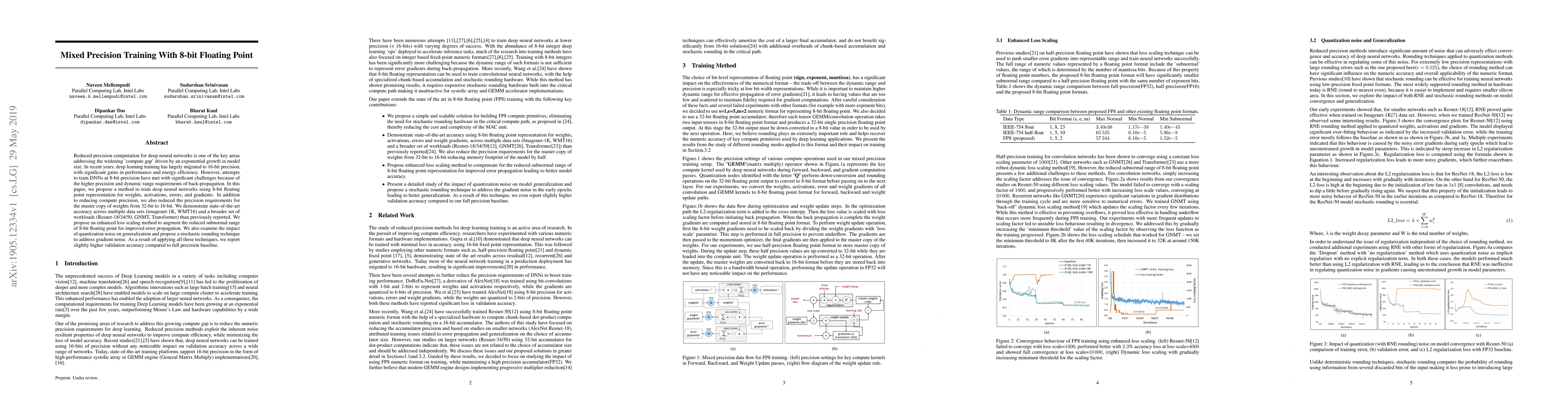 This paper proposes a method for training deep neural networks using 8-bit floating point precision, addressing challenges in back-propagation through enhanced loss scaling and stochastic rounding. The approach achieves state-of-the-art accuracy across multiple datasets and workloads while maintaining slightly higher validation accuracy than full precision baselines.