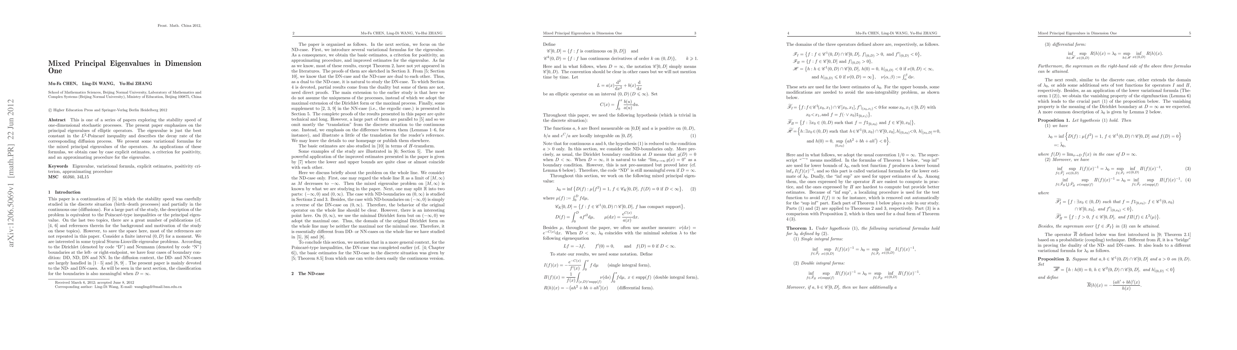 This is one of a series of papers exploring the stability speed of one-dimensional stochastic processes. The present paper emphasizes on the principal eigenvalues of elliptic operators. The eigenvalue is just the best constant in the $L^{2}$-Poincar\'e inequality and describes the decay rate of the corresponding diffusion process. We present some variational formulas for the mixed principal eigenvalues of the operators. As applications of these formulas, we obtain case by case explicit estimates, a criterion for positivity, and an approximating procedure for the eigenvalue.