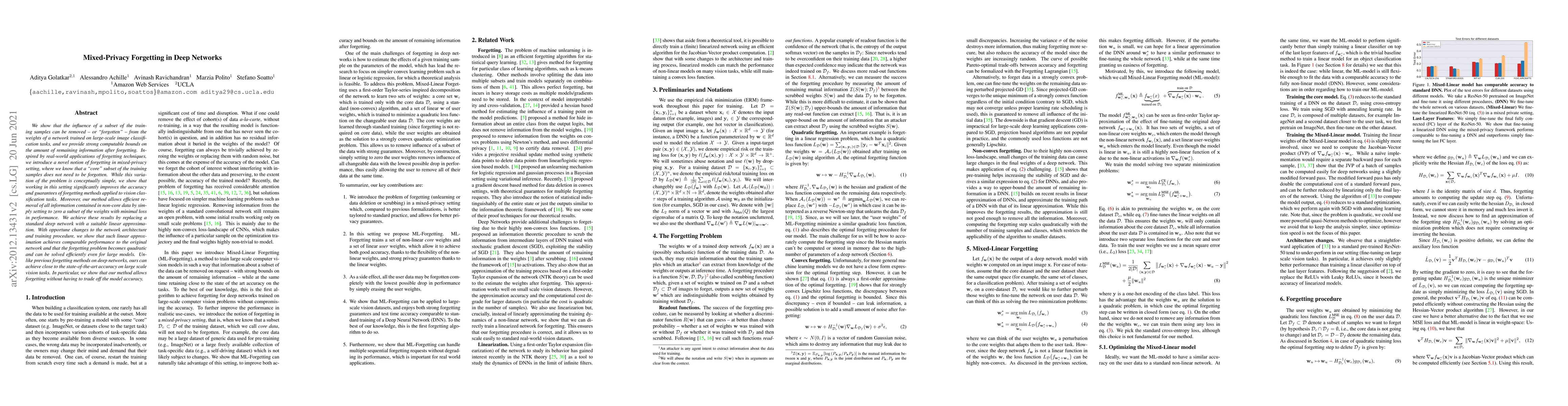 We show that the influence of a subset of the training samples can be removed -- or "forgotten" -- from the weights of a network trained on large-scale image classification tasks, and we provide strong computable bounds on the amount of remaining information after forgetting. Inspired by real-world applications of forgetting techniques, we introduce a novel notion of forgetting in mixed-privacy setting, where we know that a "core" subset of the training samples does not need to be forgotten. While this variation of the problem is conceptually simple, we show that working in this setting significantly improves the accuracy and guarantees of forgetting methods applied to vision classification tasks. Moreover, our method allows efficient removal of all information contained in non-core data by simply setting to zero a subset of the weights with minimal loss in performance. We achieve these results by replacing a standard deep network with a suitable linear approximation. With opportune changes to the network architecture and training procedure, we show that such linear approximation achieves comparable performance to the original network and that the forgetting problem becomes quadratic and can be solved efficiently even for large models. Unlike previous forgetting methods on deep networks, ours can achieve close to the state-of-the-art accuracy on large scale vision tasks. In particular, we show that our method allows forgetting without having to trade off the model accuracy.