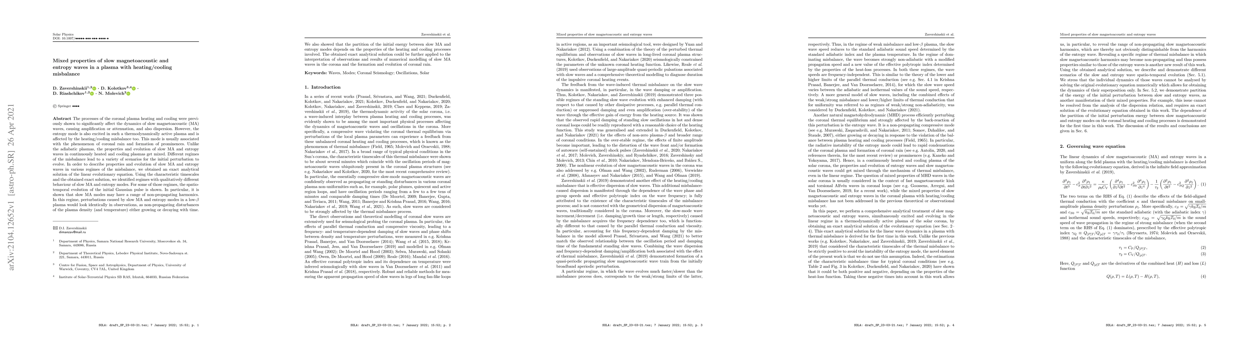 This paper investigates the mixed properties of slow magnetoacoustic and entropy waves in coronal plasmas with heating/cooling imbalances, deriving an exact analytical solution to describe their evolution. The study reveals distinct regimes where the behavior of these waves varies, showing that slow magnetoacoustic modes can exhibit non-propagating harmonics, and the initial energy partition depends on heating and cooling properties.