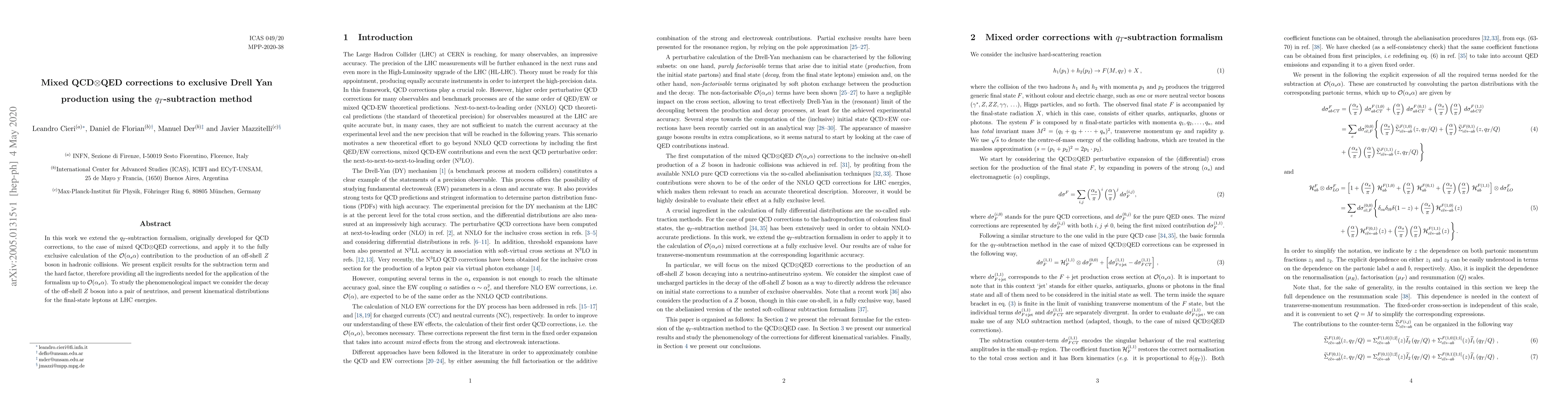 This paper extends the $q_T$-subtraction method for QCD corrections to include mixed QCD$\otimes$QED corrections, applying it to exclusive Drell-Yan production of an off-shell $Z$ boson. It provides explicit results for the subtraction term and hard factor, and examines the kinematical distributions of final-state leptons at LHC energies.