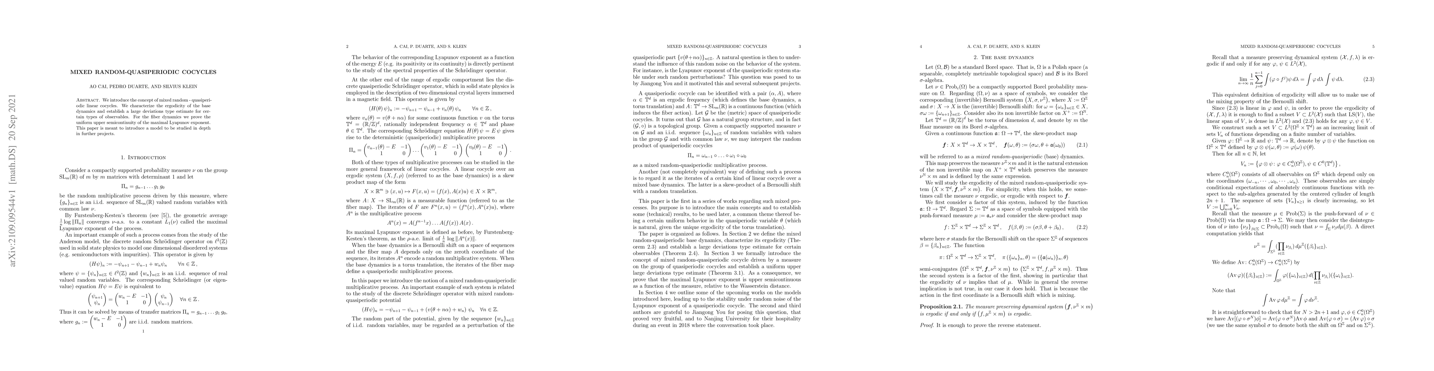 We introduce the concept of mixed random-quasiperiodic linear cocycles. We characterize the ergodicity of the base dynamics and establish a large deviations type estimate for certain types of observables. For the fiber dynamics we prove the uniform upper semicontinuity of the maximal Lyapunov exponent. This paper is meant to introduce a model to be studied in depth in further projects.