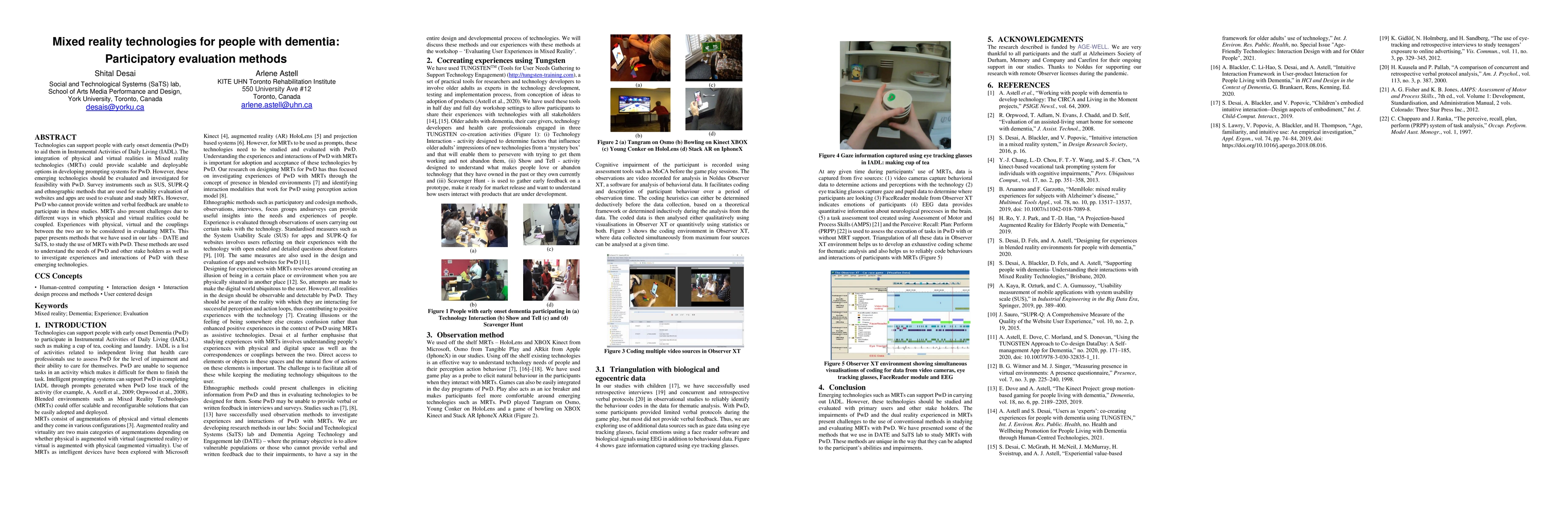 Technologies can support people with early onset dementia (PwD) to aid them in Instrumental Activities of Daily Living (IADL). The integration of physical and virtual realities in Mixed reality technologies (MRTs) could provide scalable and deployable options in developing prompting systems for PwD. However, these emerging technologies should be evaluated and investigated for feasibility with PwD. Survey instruments such as SUS, SUPR-Q and ethnographic methods that are used for usability evaluation of websites and apps are used to evaluate and study MRTs. However, PwD who cannot provide written and verbal feedback are unable to participate in these studies. MRTs also present challenges due to different ways in which physical and virtual realities could be coupled. Experiences with physical, virtual and the couplings between the two are to be considered in evaluating MRTs.