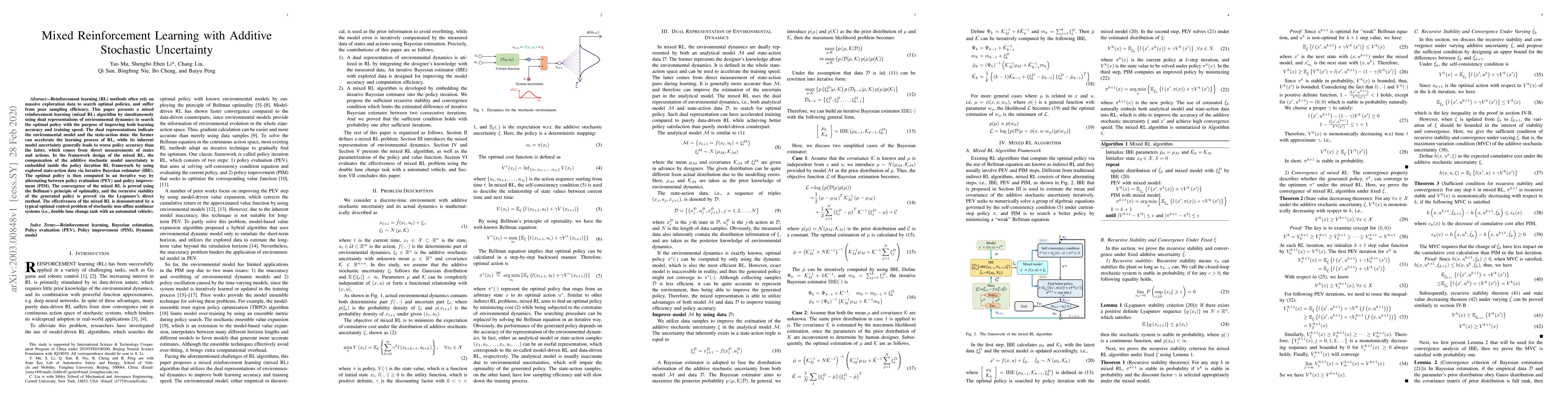 Reinforcement learning (RL) methods often rely on massive exploration data to search optimal policies, and suffer from poor sampling efficiency. This paper presents a mixed reinforcement learning (mixed RL) algorithm by simultaneously using dual representations of environmental dynamics to search the optimal policy with the purpose of improving both learning accuracy and training speed. The dual representations indicate the environmental model and the state-action data: the former can accelerate the learning process of RL, while its inherent model uncertainty generally leads to worse policy accuracy than the latter, which comes from direct measurements of states and actions. In the framework design of the mixed RL, the compensation of the additive stochastic model uncertainty is embedded inside the policy iteration RL framework by using explored state-action data via iterative Bayesian estimator (IBE). The optimal policy is then computed in an iterative way by alternating between policy evaluation (PEV) and policy improvement (PIM). The convergence of the mixed RL is proved using the Bellman's principle of optimality, and the recursive stability of the generated policy is proved via the Lyapunov's direct method. The effectiveness of the mixed RL is demonstrated by a typical optimal control problem of stochastic non-affine nonlinear systems (i.e., double lane change task with an automated vehicle).