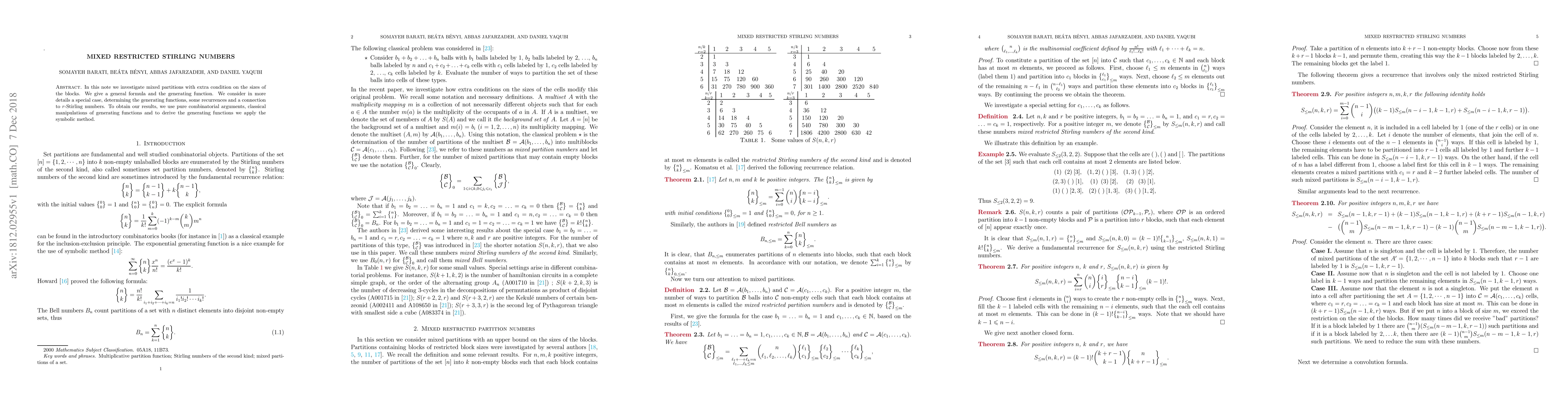 Researchers investigate mixed partitions with restrictions on block sizes, providing a general formula and generating function using combinatorial arguments and classical manipulations of generating functions.