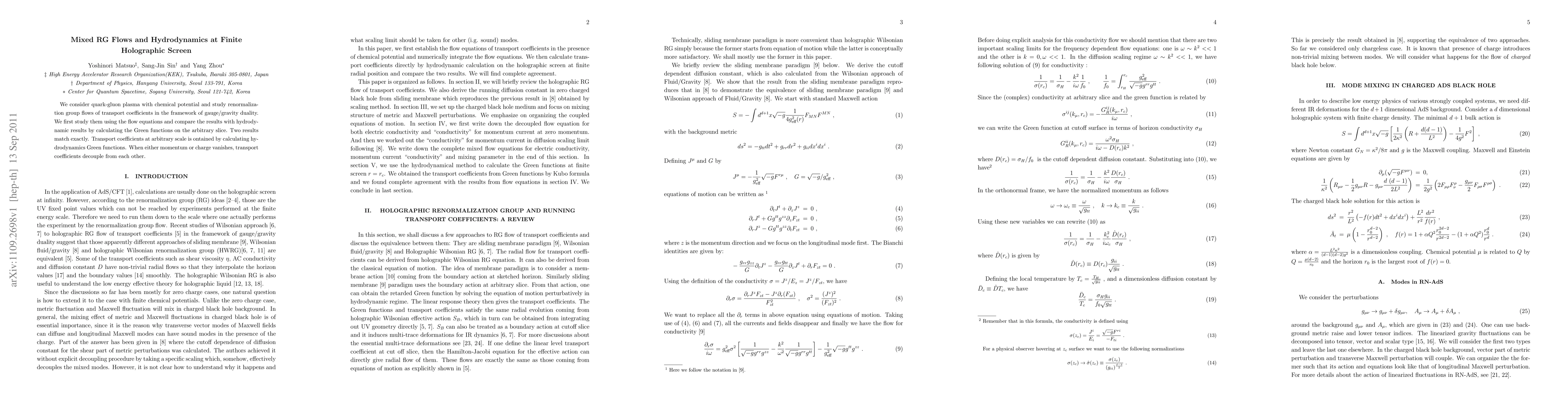 We consider quark-gluon plasma with chemical potential and study renormalization group flows of transport coefficients in the framework of gauge/gravity duality. We first study them using the flow equations and compare the results with hydrodynamic results by calculating the Green functions on the arbitrary slice. Two results match exactly. Transport coefficients at arbitrary scale is ontained by calculating hydrodynamics Green functions. When either momentum or charge vanishes, transport coefficients decouple from each other.