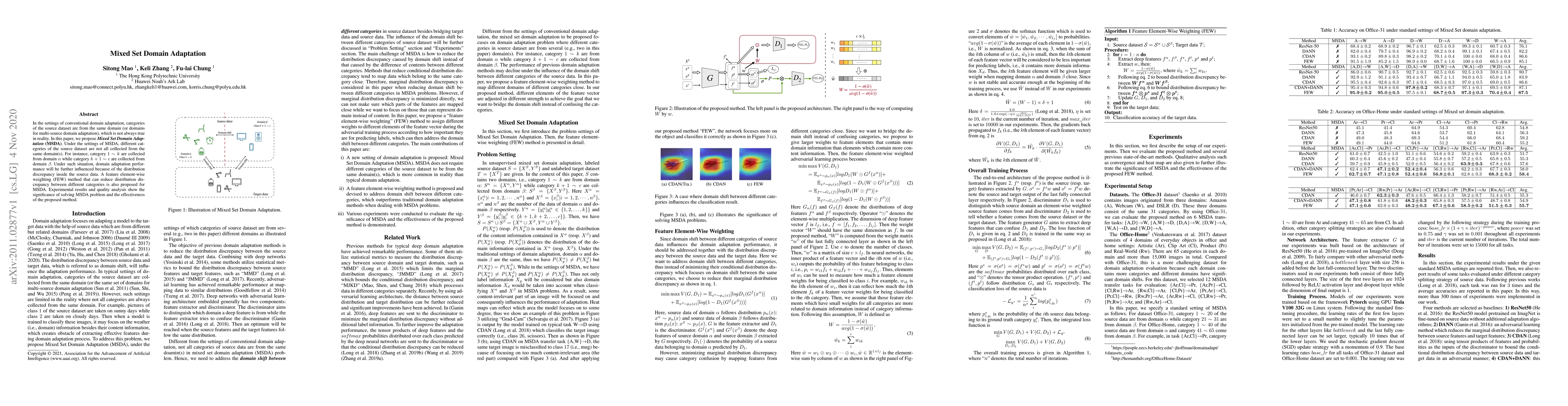 In the settings of conventional domain adaptation, categories of the source dataset are from the same domain (or domains for multi-source domain adaptation), which is not always true in reality. In this paper, we propose \textbf{\textit{Mixed Set Domain Adaptation} (MSDA)}. Under the settings of MSDA, different categories of the source dataset are not all collected from the same domain(s). For instance, category $1\sim k$ are collected from domain $\alpha$ while category $k+1\sim c$ are collected from domain $\beta$. Under such situation, domain adaptation performance will be further influenced because of the distribution discrepancy inside the source data. A feature element-wise weighting (FEW) method that can reduce distribution discrepancy between different categories is also proposed for MSDA. Experimental results and quality analysis show the significance of solving MSDA problem and the effectiveness of the proposed method.