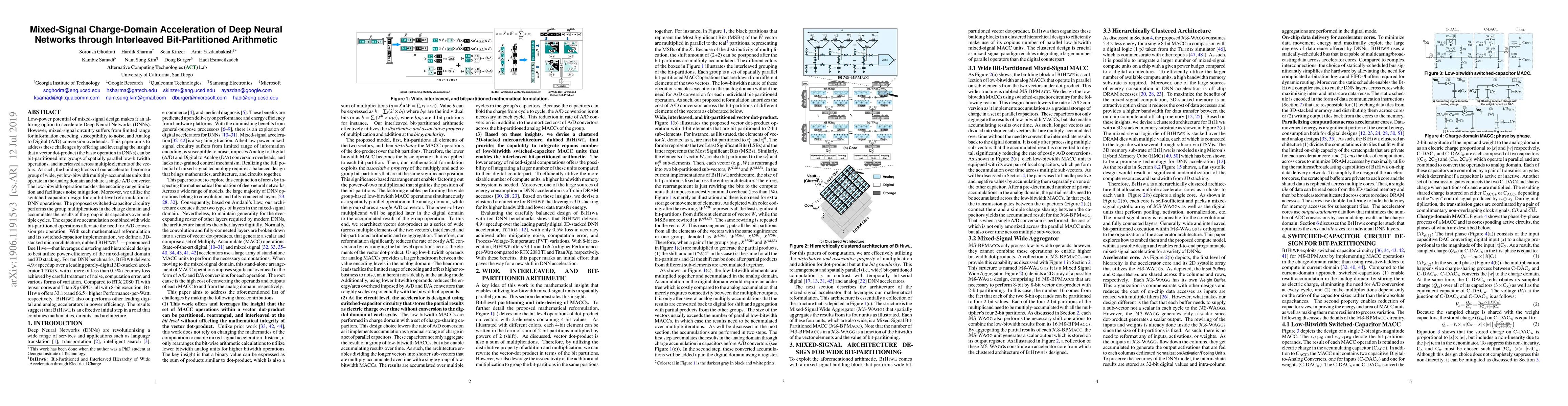Low-power potential of mixed-signal design makes it an alluring option to accelerate Deep Neural Networks (DNNs). However, mixed-signal circuitry suffers from limited range for information encoding, susceptibility to noise, and Analog to Digital (A/D) conversion overheads. This paper aims to address these challenges by offering and leveraging the insight that a vector dot-product (the basic operation in DNNs) can be bit-partitioned into groups of spatially parallel low-bitwidth operations, and interleaved across multiple elements of the vectors. As such, the building blocks of our accelerator become a group of wide, yet low-bitwidth multiply-accumulate units that operate in the analog domain and share a single A/D converter. The low-bitwidth operation tackles the encoding range limitation and facilitates noise mitigation. Moreover, we utilize the switched-capacitor design for our bit-level reformulation of DNN operations. The proposed switched-capacitor circuitry performs the group multiplications in the charge domain and accumulates the results of the group in its capacitors over multiple cycles. The capacitive accumulation combined with wide bit-partitioned operations alleviate the need for A/D conversion per operation. With such mathematical reformulation and its switched-capacitor implementation, we define a 3D-stacked microarchitecture, dubbed BIHIWE.