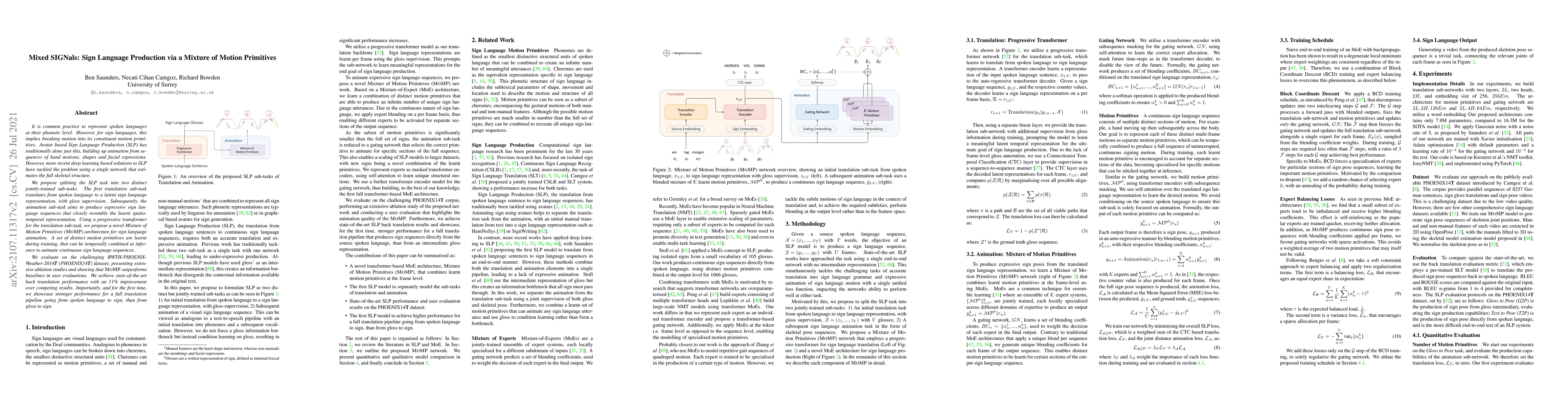 This paper proposes a novel Mixture of Motion Primitives (MoMP) architecture for avatar-based Sign Language Production (SLP) by splitting the task into two jointly-trained sub-tasks: translation from spoken language to a latent sign language representation and animation to produce expressive sign sequences. The MoMP architecture outperforms baselines and achieves state-of-the-art back translation performance, demonstrating better full translation pipeline results from spoken to sign than from gloss to sign.
