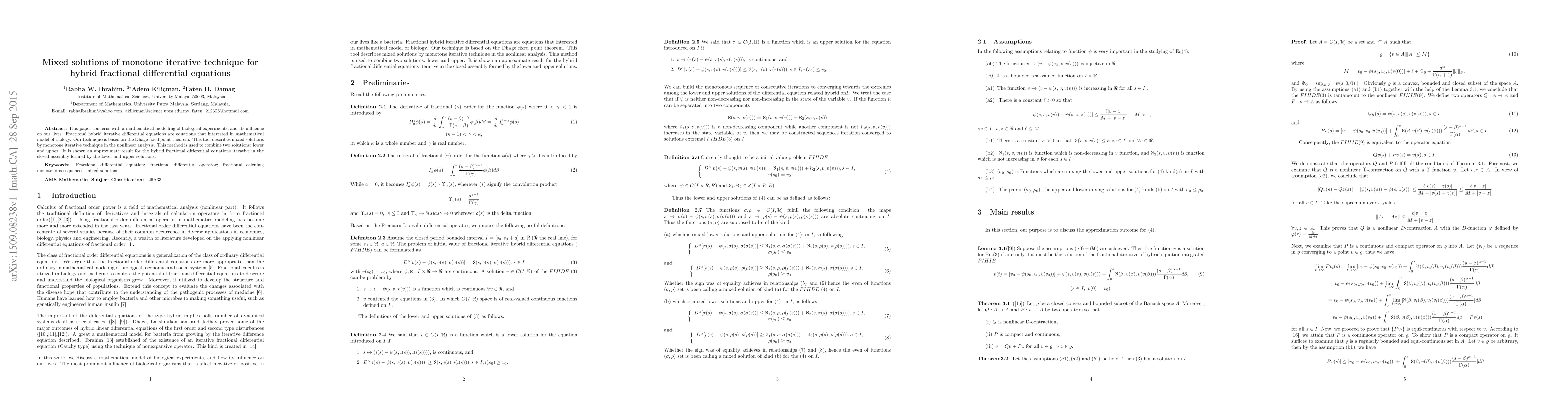 This paper employs the Dhage fixed point theorem and a monotone iterative technique to solve mixed solutions for hybrid fractional differential equations, which model biological experiments. The method combines lower and upper solutions to provide an approximate result for these complex equations.
