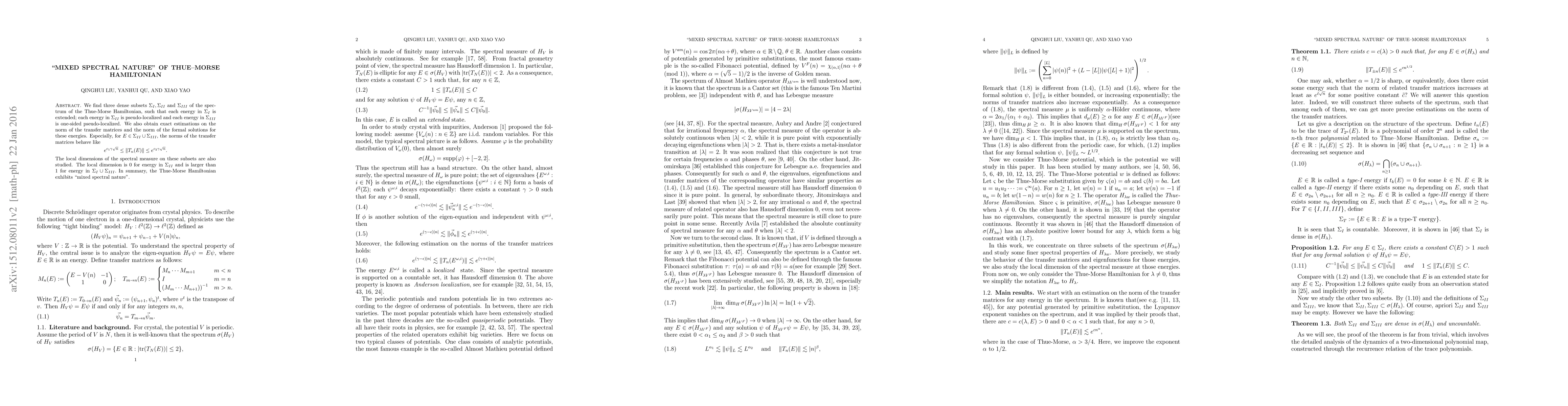 We find three dense subsets $\Sigma_I,\Sigma_{II}$ and $\Sigma_{III}$ of the spectrum of the Thue-Morse Hamiltonian, such that each energy in $\Sigma_I$ is extended, each energy in $\Sigma_{II}$ is pseudo-localized and each energy in $\Sigma_{III}$ is one-sided pseudo-localized. We also obtain exact estimations on the norm of the transfer matrices and the norm of the formal solutions for these energies. Especially, for $E\in \Sigma_{II}\cup\Sigma_{III}, $ the norms of the transfer matrices behave like $$ e^{c_1\gamma\sqrt{n}}\le\|T_{n}(E)\|\le e^{c_2\gamma\sqrt{n}}. $$ The local dimensions of the spectral measure on these subsets are also studied. The local dimension is $0$ for energy in $\Sigma_{II}$ and is larger than $1$ for energy in $\Sigma_{I}\cup\Sigma_{III}.$ In summary, the Thue-Morse Hamiltonian exhibits "mixed spectral nature".
